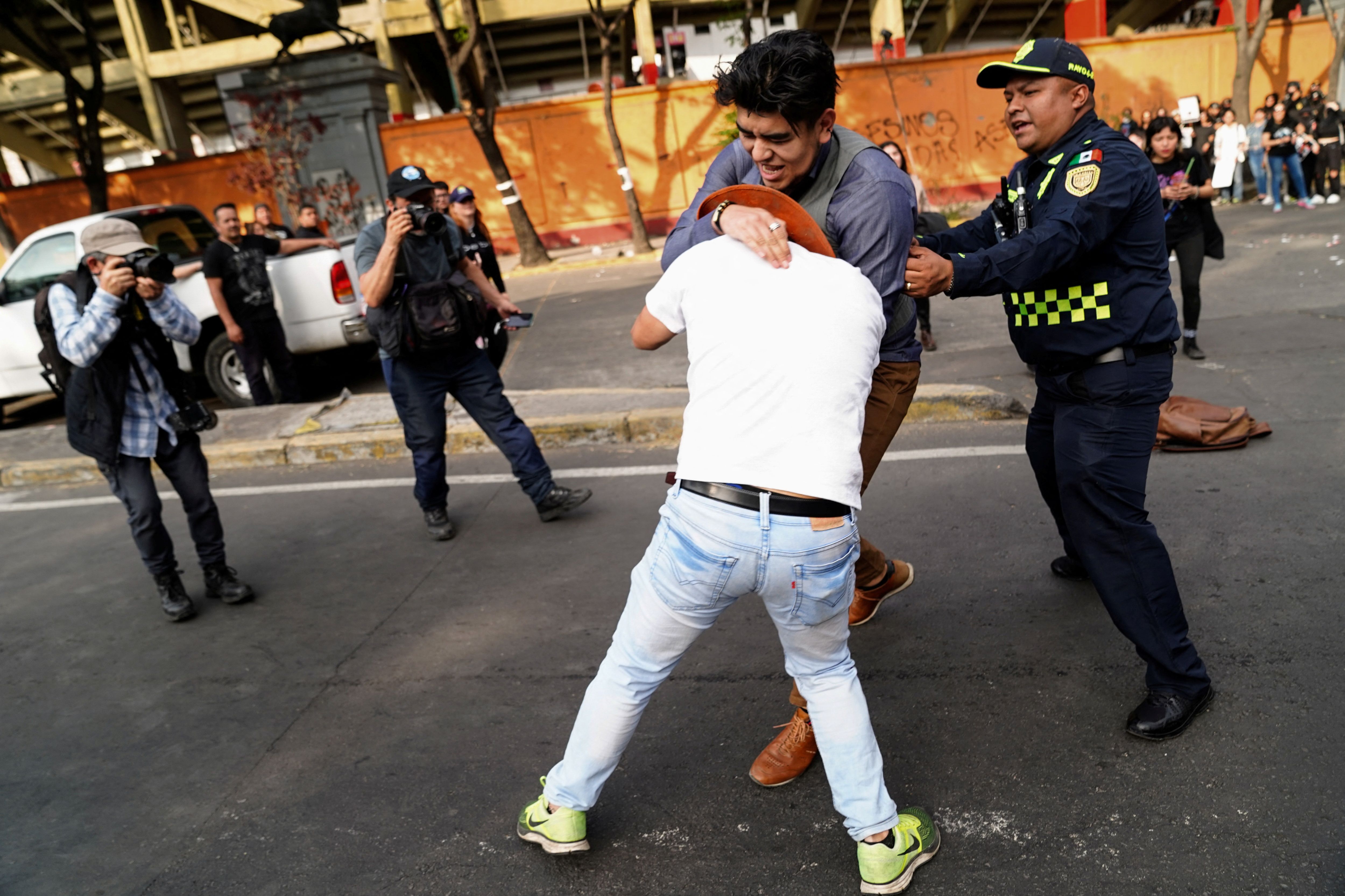 Protesters clash with attendees during a protest against the return of bullfighting, outside the Plaza de Toros Mexico bullfighting ring, in Mexico City, Mexico, on January 28, 2024. (Photo by Toya Sarno Jordan/Reuters)
