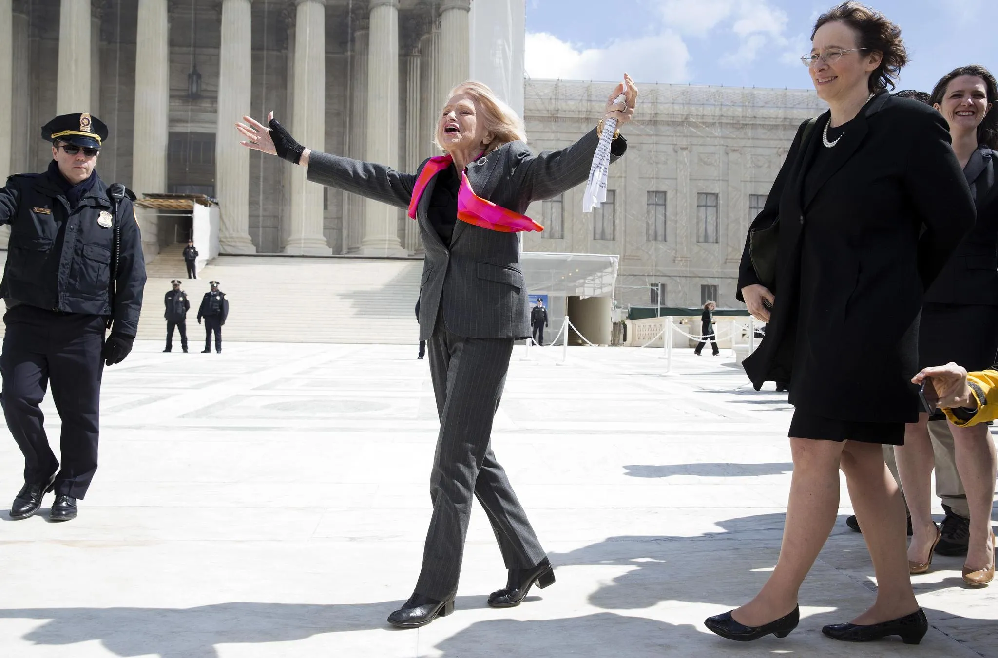 Edie Windsor, plaintiff in the hearing against the Defense of Marriage Act, celebrates after arguments outside the Supreme Court in Washington on March 27, 2013. When Edith Windsor got engaged in the 1960s to the woman who eventually became her wife she asked for a pin instead of a ring. A ring would have meant awkward questions, she said: Who is he? And when do we meet him? On Wednesday, the 83-year-old stood in front of the U.S. Supreme Court, the face of a case that could change how the U.S. government treats married gay couples. Windsor, whose wife Thea Spyer died in 2009, sued to challenge a $363,000 federal estate tax bill she got after Spyer's death. The pair married in Canada in 2007. Had Windsor been married to a man she would not have paid any estate tax. (Photo by Joshua Roberts/Reuters)