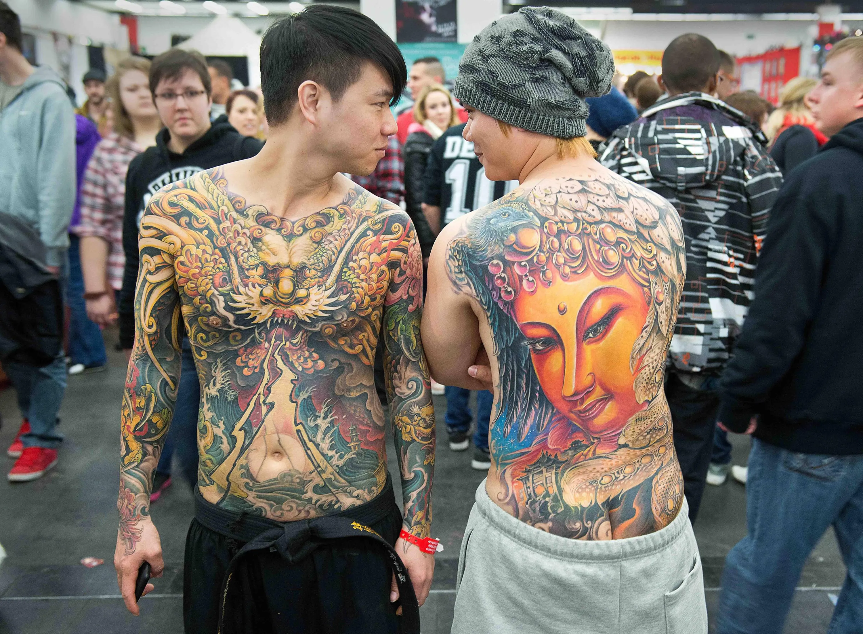 Two young men pose with their huge tattoos at the International tattoo Convention in Frankfurt, Germany, Saturday March 23, 2013. (Photo by Boris Roessler/AP Photo/Dpa)
