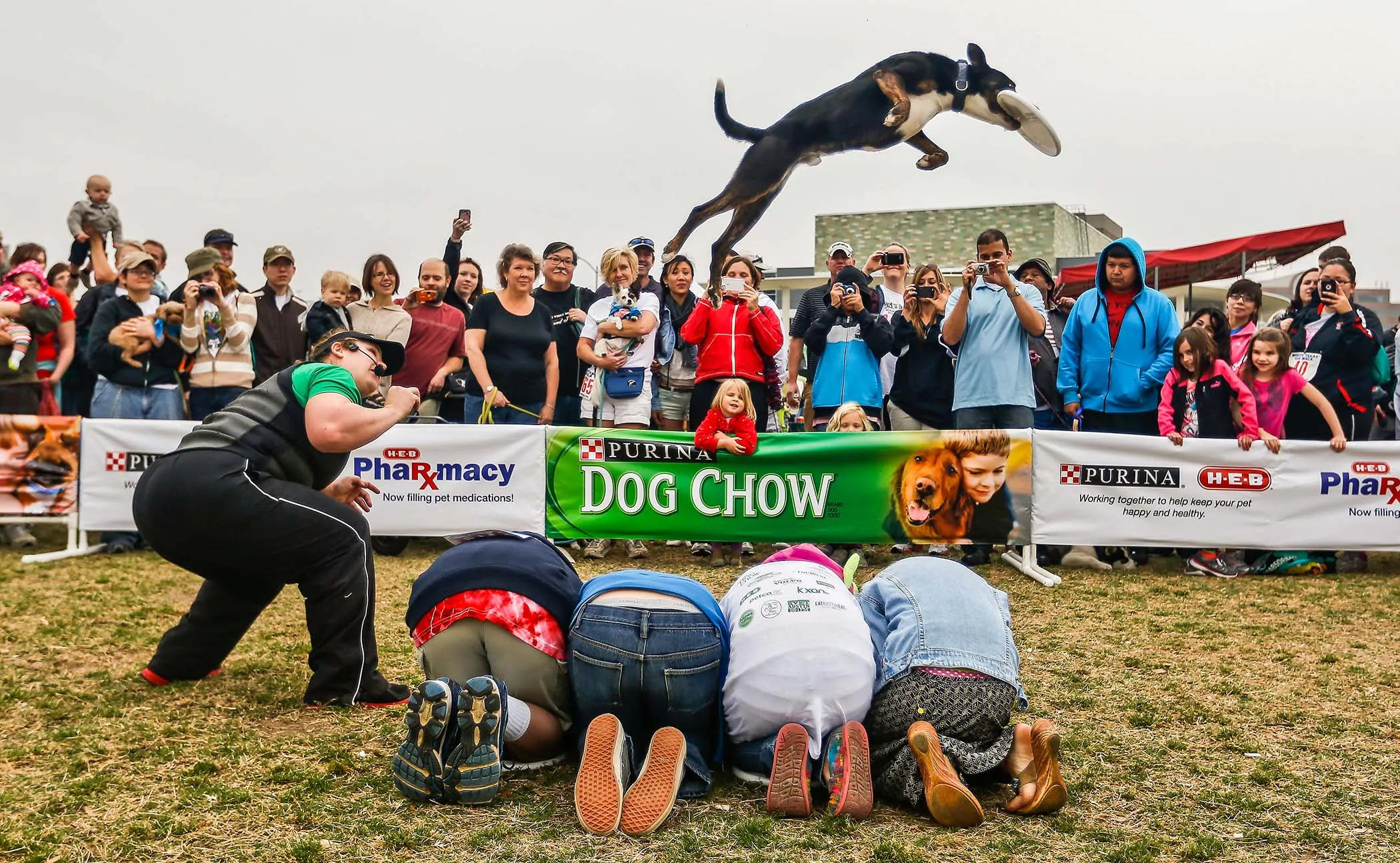 Laura Moretz watches her dog Hustle jump over four kids to catch a Frisbee during the Purina Incredible dog trick show at the 15th annual Mighty Texas Dog Walk, an event fundraiser for Texas Hearing and Service Dogs, on March 23, 2013. THSD rescues dogs and trains them to be service animals for people with hearing loss and physical disabilities. (Photo by Ricardo B. Brazziell/American-Statesman)
