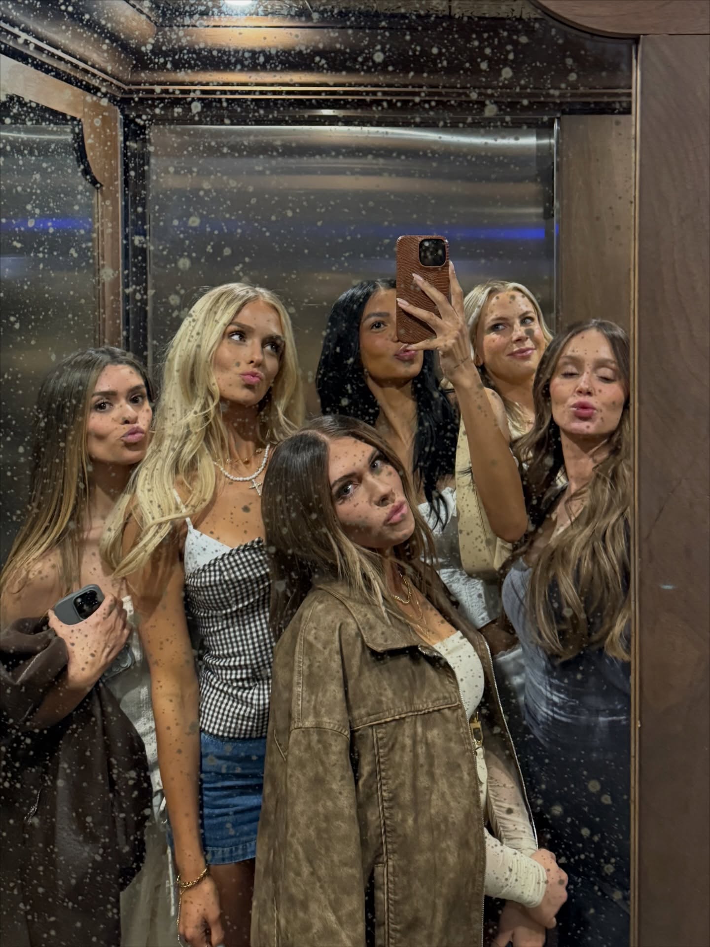 The cast of “The Secret Lives of Mormon Wives” crowd into an elevator in a silly snap while announcing season 4 on November 25, 2025. (Photo by laylaleannetaylor/Instagram)