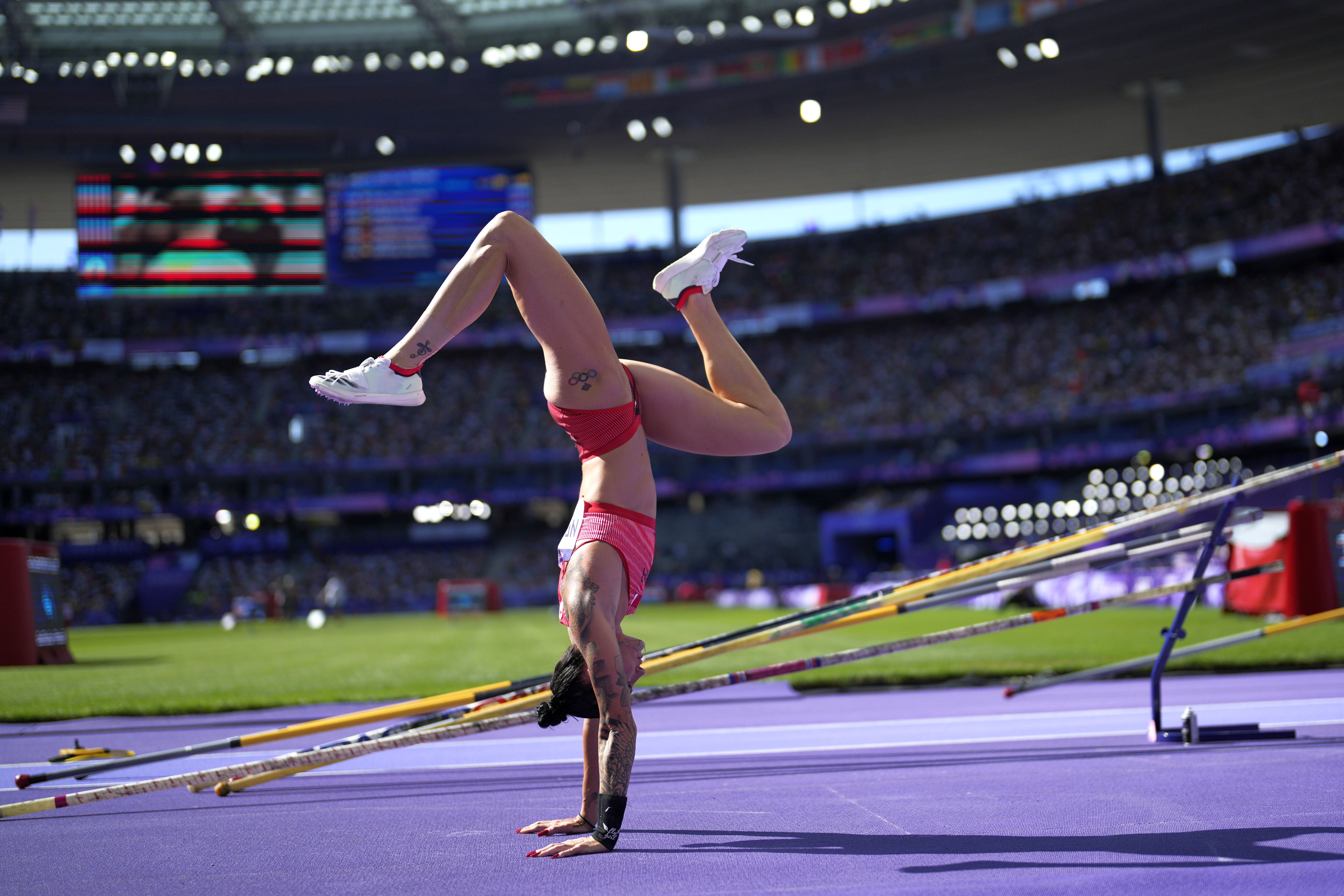 Anicka Newell, of Canada, prepares for the women's pole vault qualification at the 2024 Summer Olympics, Monday, August 5, 2024, in Saint-Denis, France. (Photo by Bernat Armangue/AP Photo)