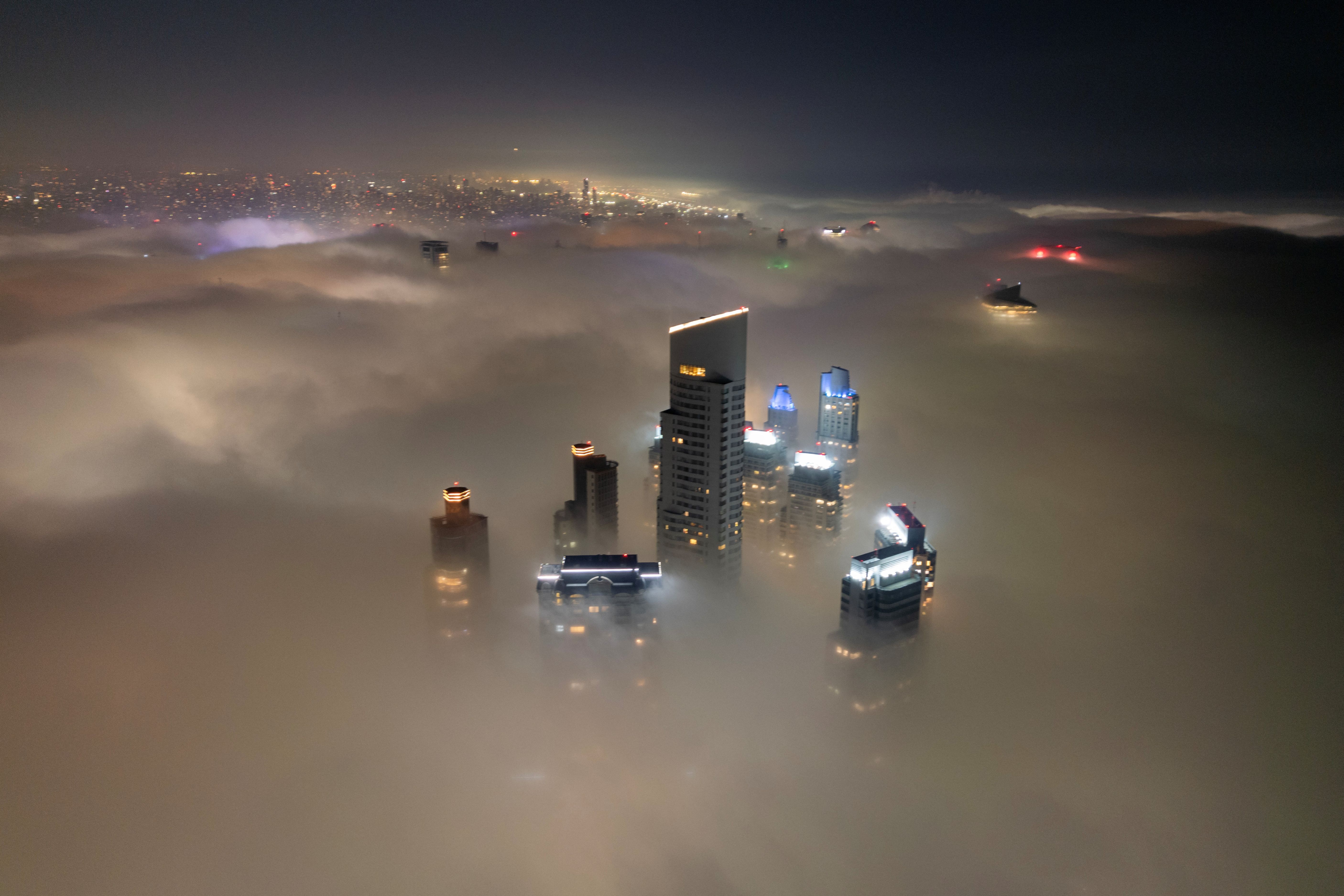 Aerial view of skyscrapers covered in fog in Buenos Aires on July 8, 2025. (Photo by Luis Robayo/AFP Photo)