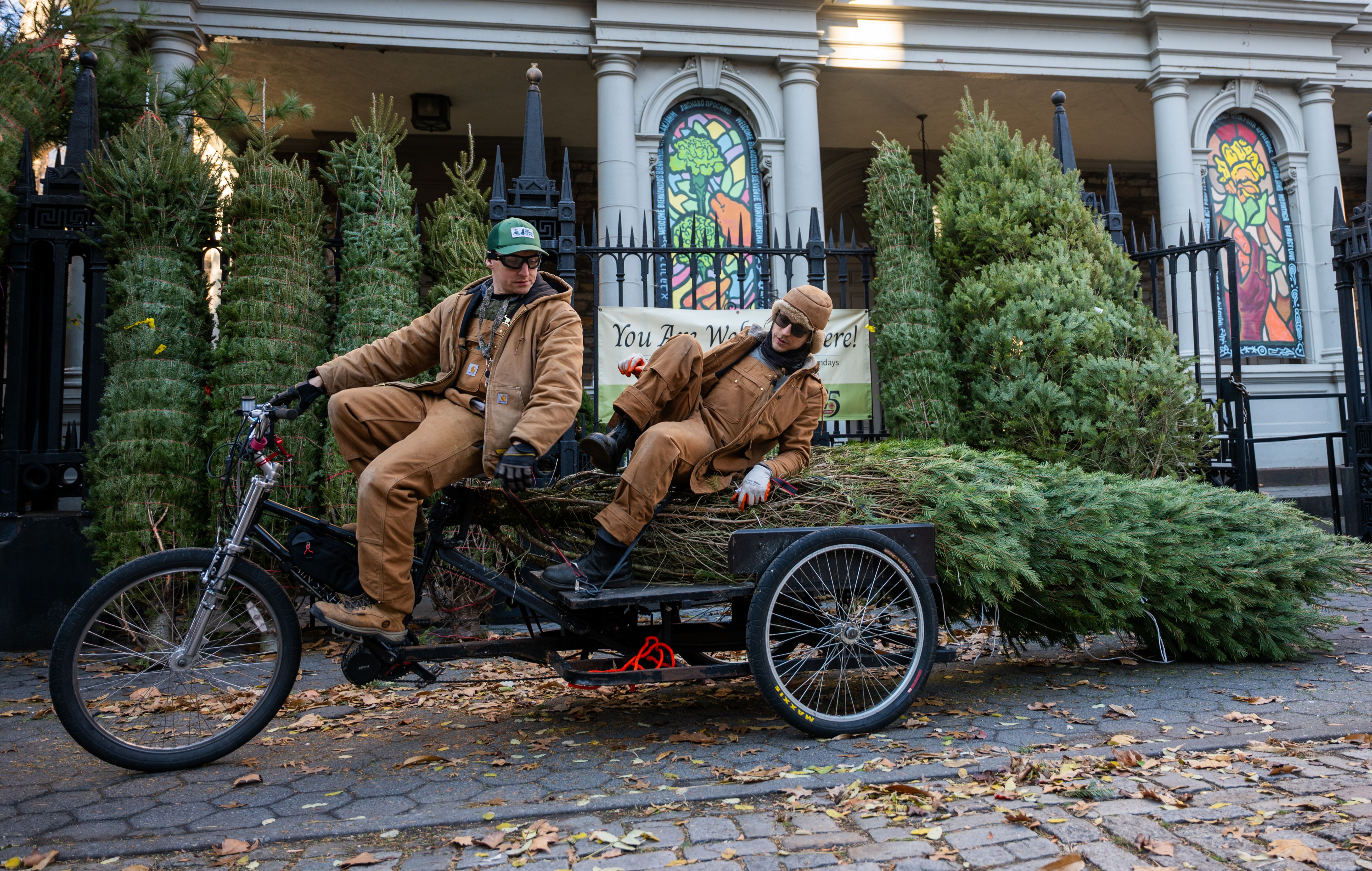 Workers with Tree Riders NYC move a Christmas tree at their location in the East Village in Manhattan on December 03, 2025, in New York City. Every year, hundreds of workers descend onto Manhattan street corners where, for 5 to 6 weeks, they sell trees in an increasingly competitive market. Because of continued tariffs, the cost of an artificial tree is estimated to be 10% to 20% higher than last year, making real trees a potentially cheaper alternative. (Photo by Spencer Platt/Getty Images)