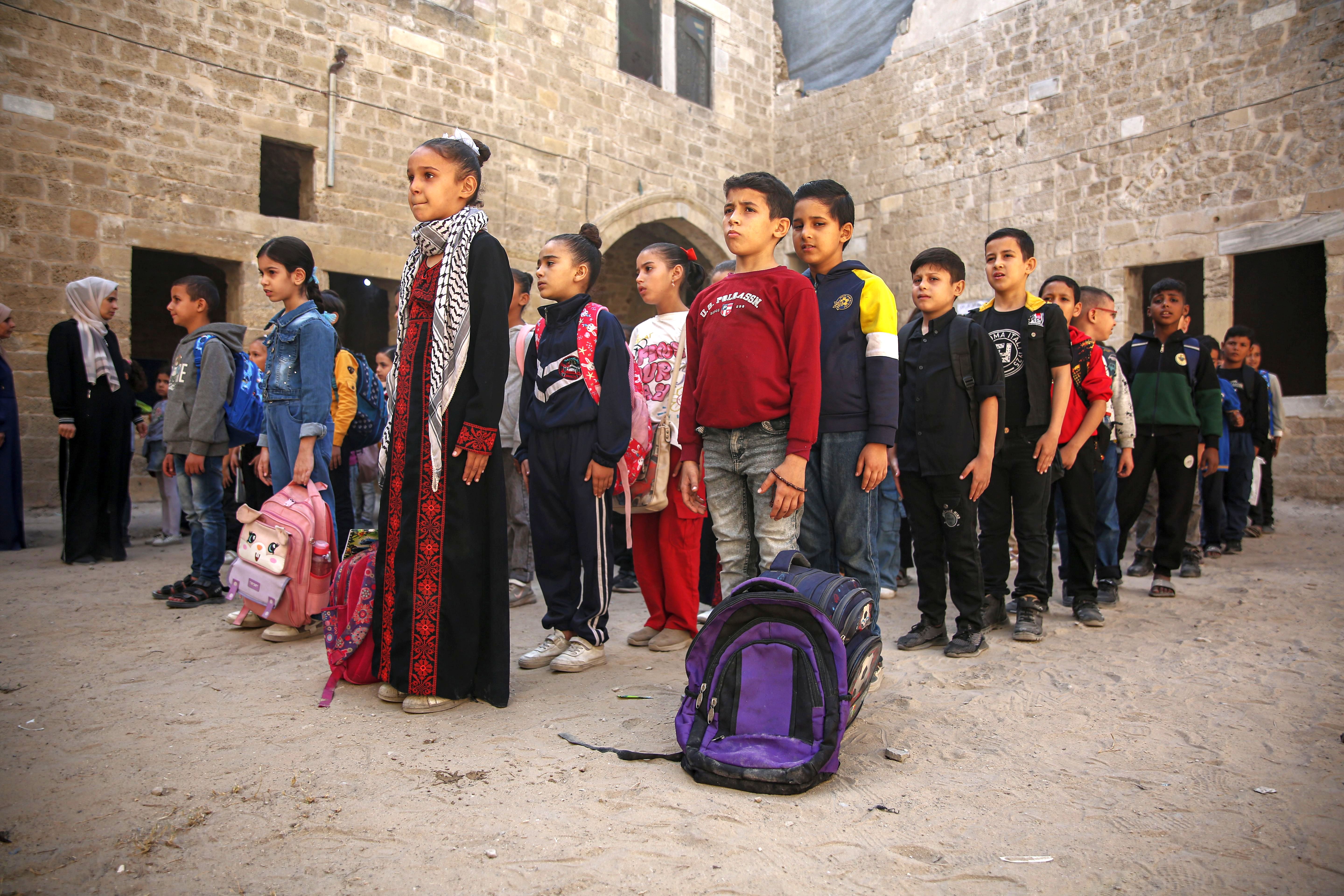 Palestinian students attend classes at the historic Al-Kamaliya School in the Al-Zaytoun neighborhood of Gaza City, reopened by the East Gaza Directorate of Education to resume learning after the war on November 1, 2025. (Photo by APAImages/Rex Features/Shutterstock)