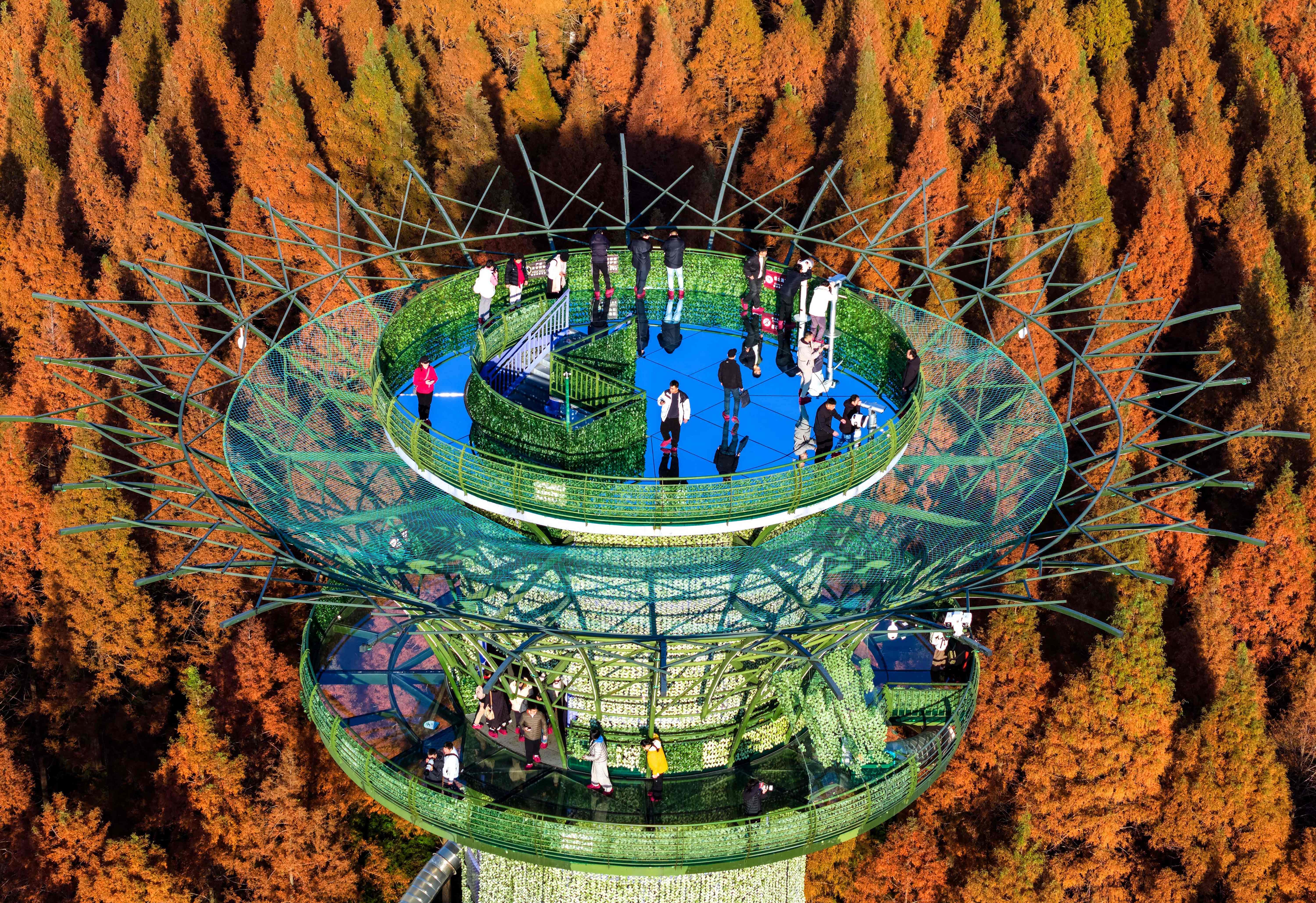 People visit the Yellow Sea forest park as the leaves of Dawn Redwoods turn red and yellow in winter in Yancheng, eastern China's Jiangsu province on December 4, 2025. (Photo by AFP Photo/China Stringer Network)