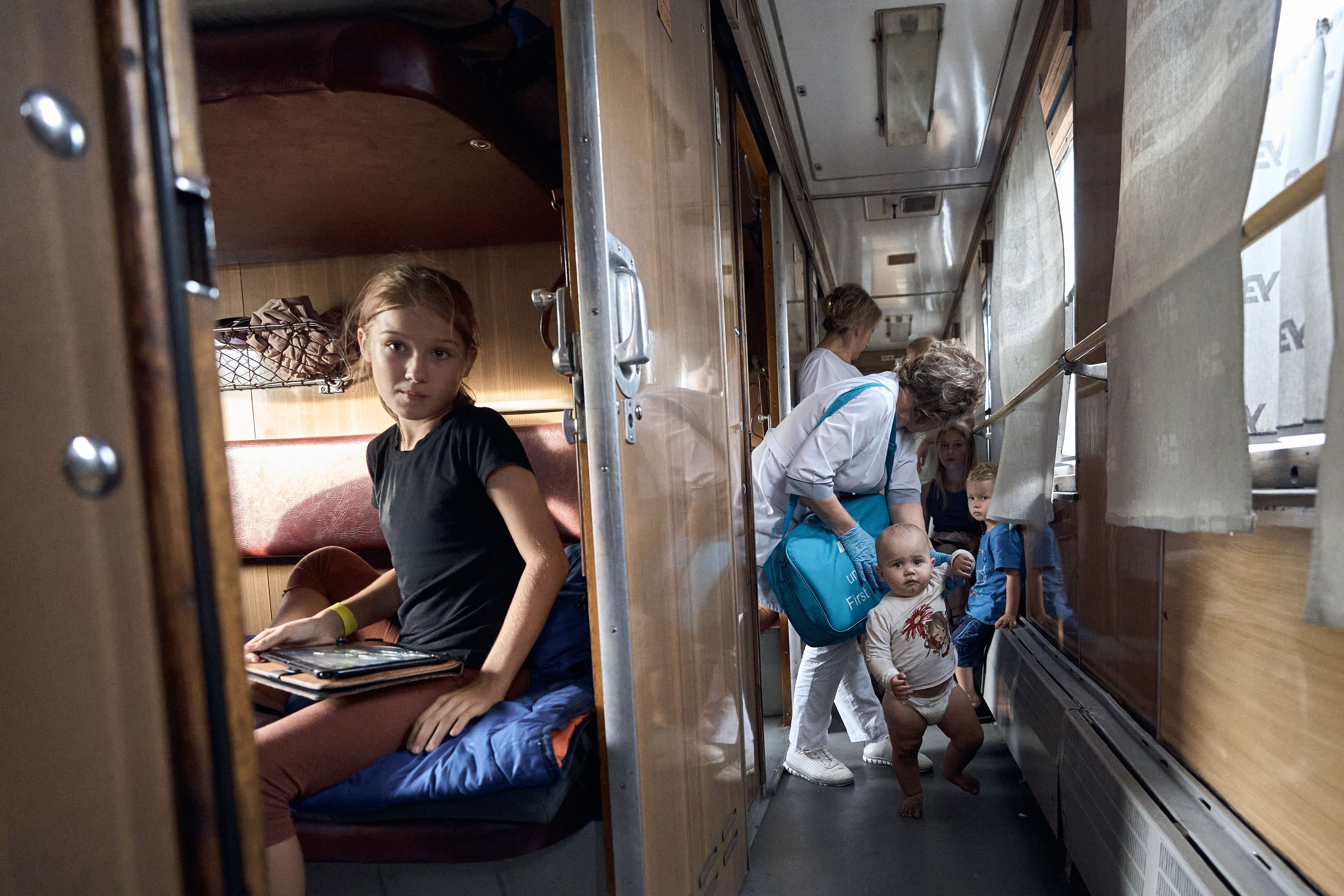 Children being evacuated by Ukrainian Railways from the frontline city of Pokrovsk to Dnipro, Ukraine on August 31, 2024 in Pokrovsk, Ukraine. Today, 370 individuals were safely transported to a safer location. The Russian army has approached the city to a distance of less than 10 kilometers, and there is significant tension on the front lines. (Photo by Vlada Liberova/Libkos/Getty Images)