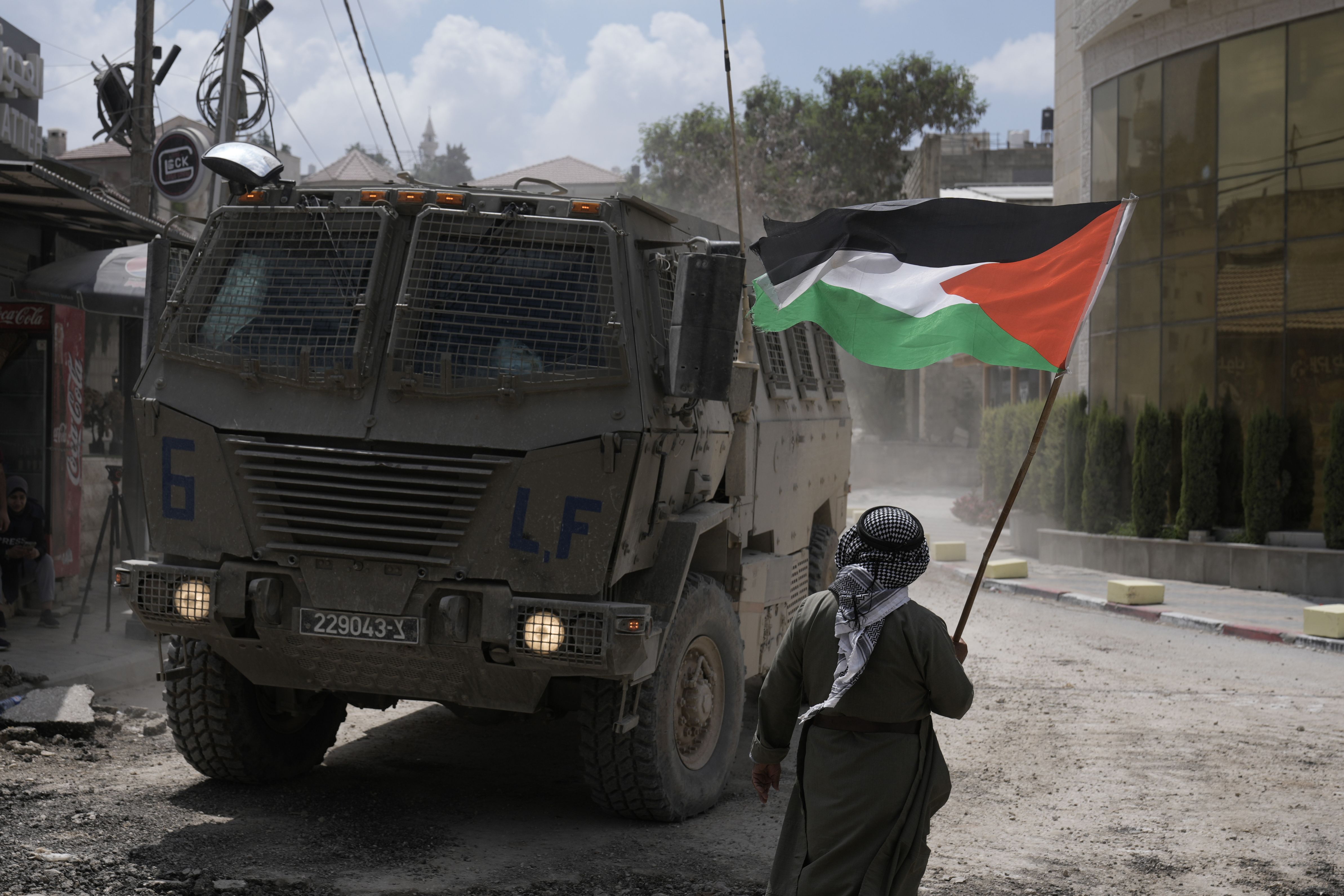 A man waves a Palestinian flag as an Israeli armoured vehicle moves on a street during a military operation in the West Bank refugee camp of Nur Shams, Tulkarem, Thursday, August 29, 2024. (Photo by Majdi Mohammed/AP Photo)