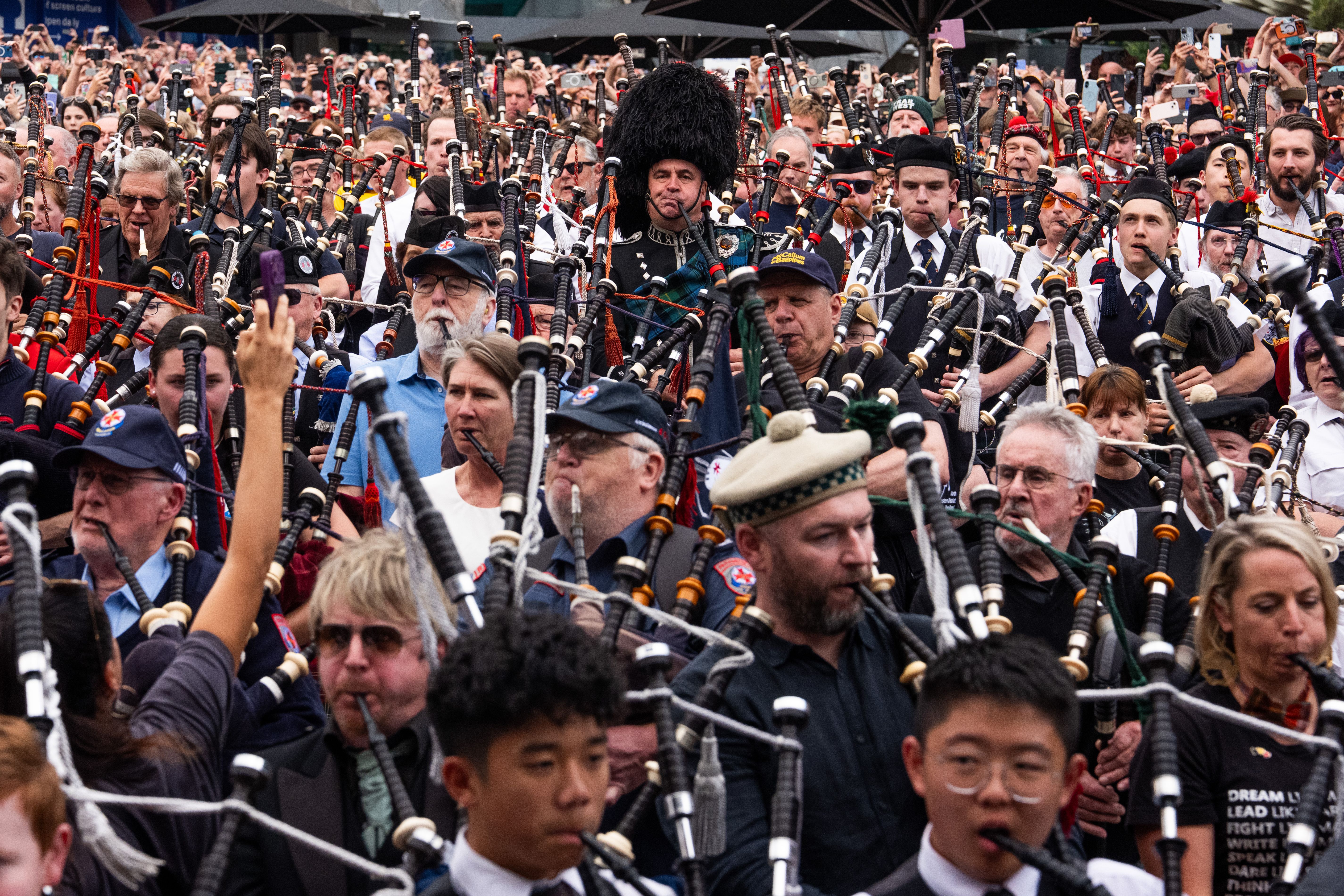 Bagpipers perform at Federation Square on November 12, 2025 in Melbourne, Australia. More than 350 pipers performed AC/DC's “It's a long way to the top (if you wanna rock 'n roll)” live, breaking the world record for largest ever bagpipe ensemble, previously set by 333 pipers in Sofia, Bulgaria in 2012. (Photo by Asanka Ratnayake/Getty Images)