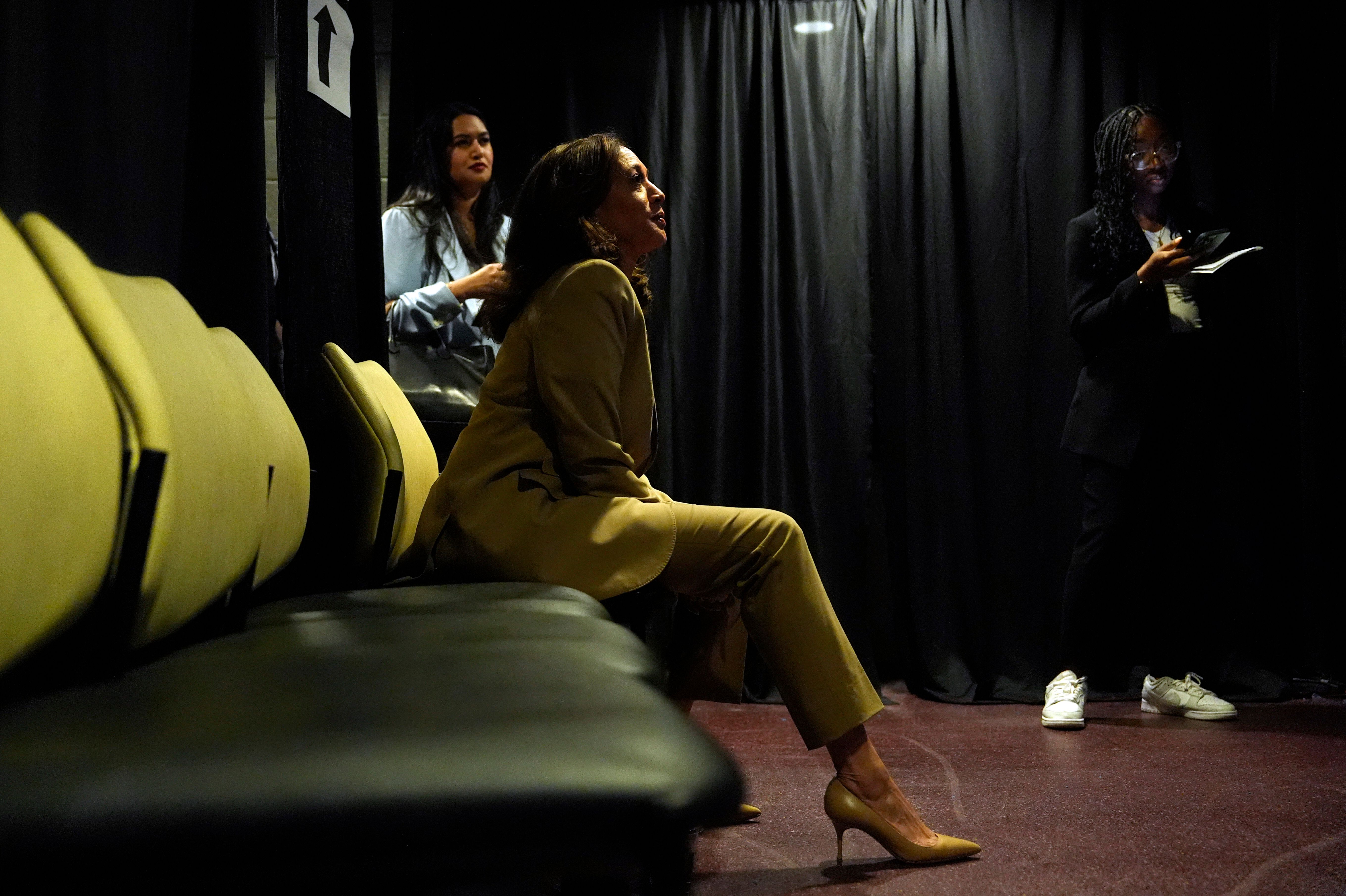 US Vice President and Democratic presidential candidate Kamala Harris sits backstage and listens to Minnesota Governor and Democratic vice presidential candidate Tim Walz speak during a a campaign event at Desert Diamond Arena in Phoenix, Arizona, on August 9, 2024. (Photo by Julia Nikhinson/Pool via AFP Photo)