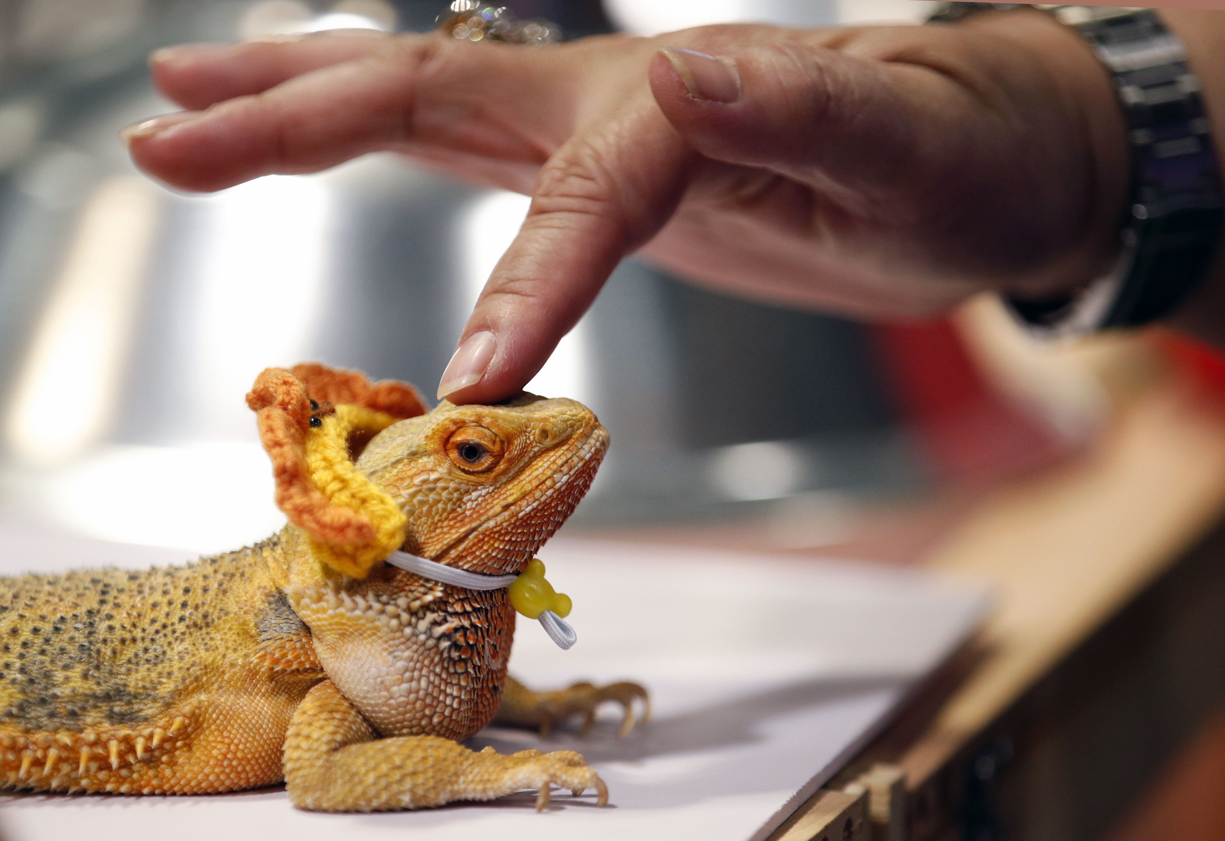 An animal enthusiast touches a Bearded Dragon displayed for sale as exotic pet at Thailand Reptile and Exotic Expo in Bangkok, Thailand, 02 August 2024. The Thailand Reptile and Exotic Expo is a trade showcase exhibiting hundreds of reptiles and exotic animals from breeders to sell as exotic pets for enthusiasts. (Photo by Rungroj Yongrit/EPA)