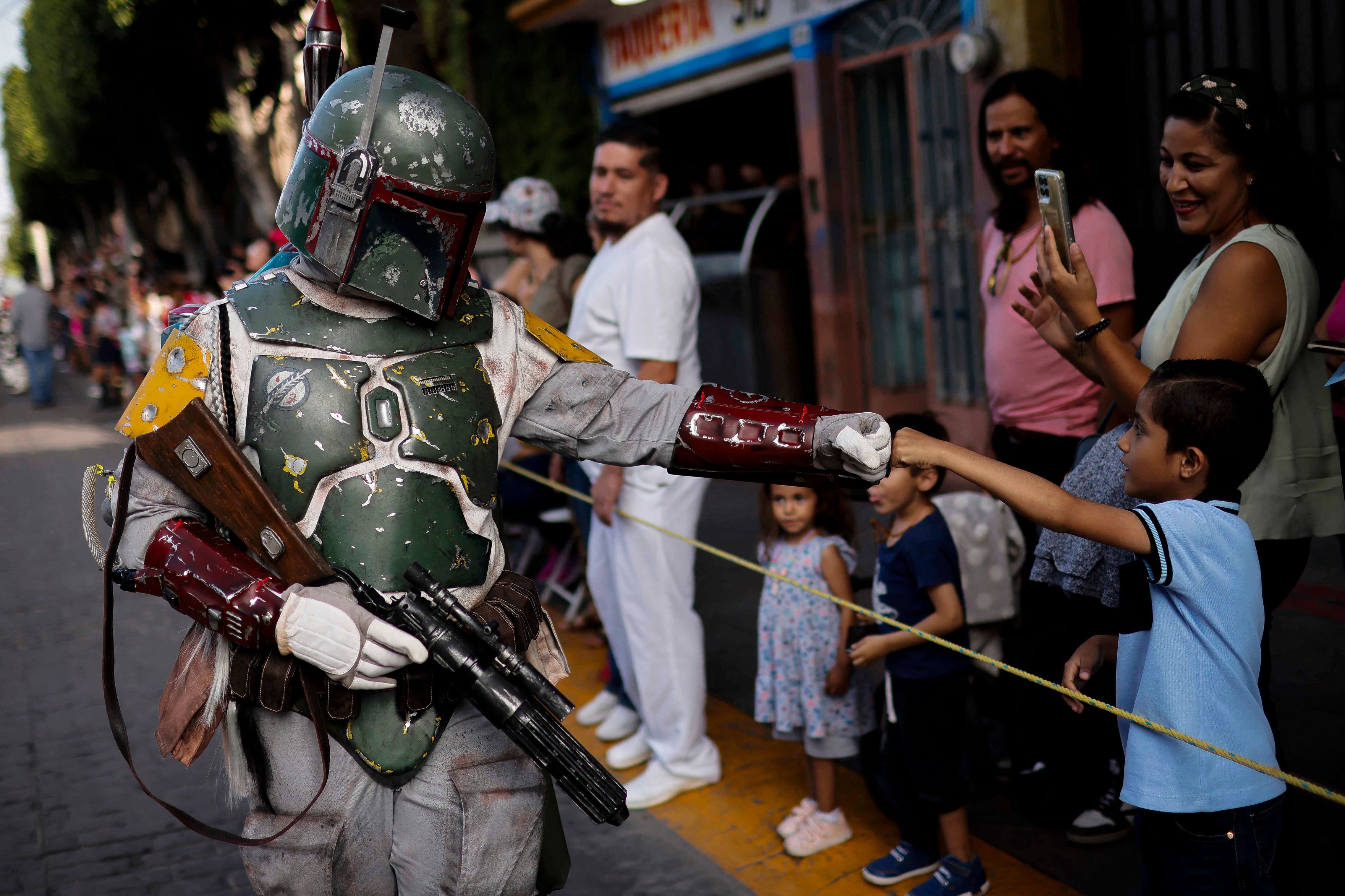 A fan of the Star Wars saga fancy dressed as a character greets with a fist bumb to a kid during the so-called “Training Day” parade at Los Heroes Avenue in Leon, Guanajuato State, Mexico, on August 10, 2024. (Photo by Rodrigo Oropeza/AFP Photo)