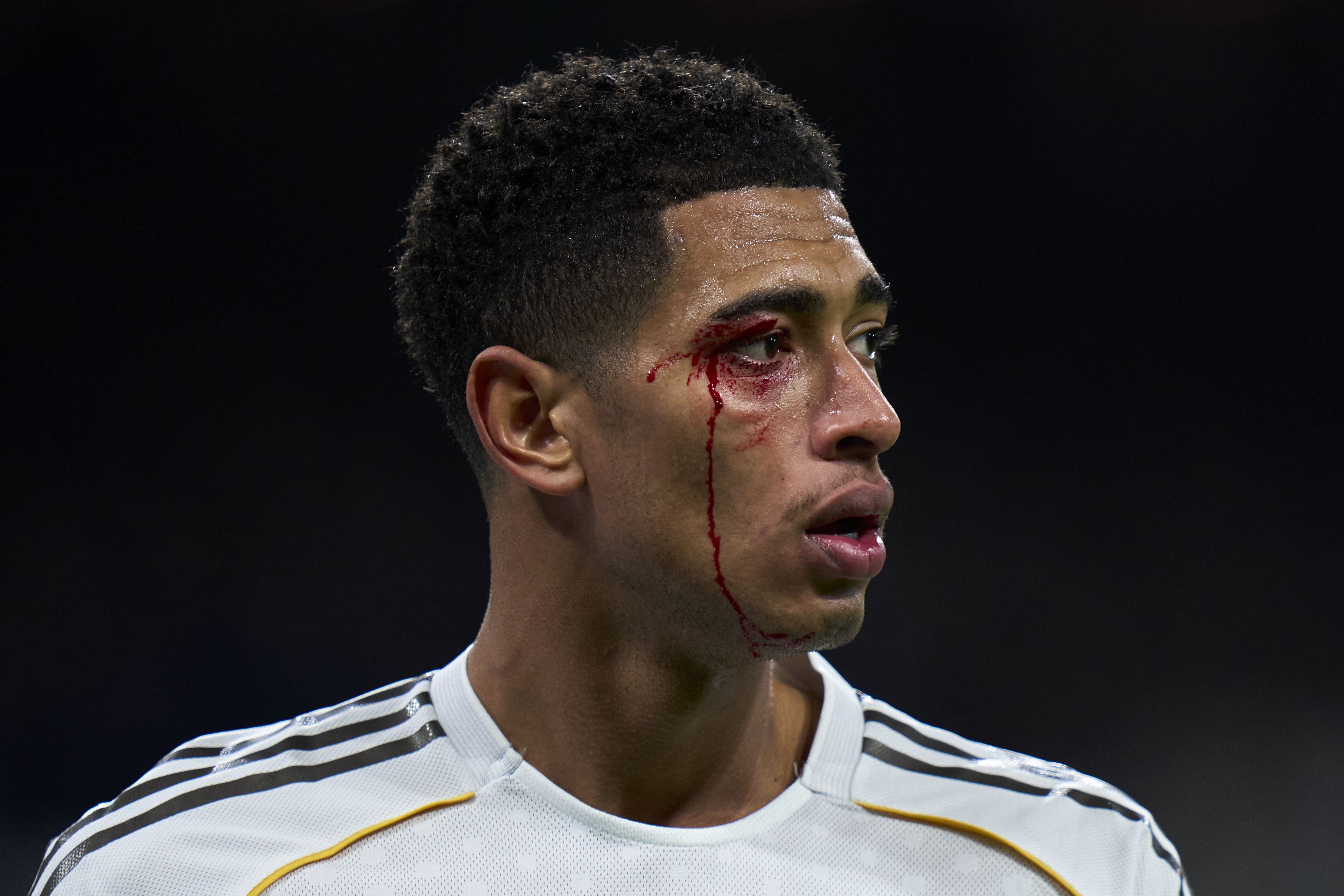 Jude Bellingham of Real Madrid CF looks on with a cut on his eyebrow during the LaLiga EA Sports match between Real Madrid CF and RC Celta de Vigo at Estadio Santiago Bernabeu on December 07, 2025 in Madrid, Spain. (Photo by Diego Souto/Getty Images)