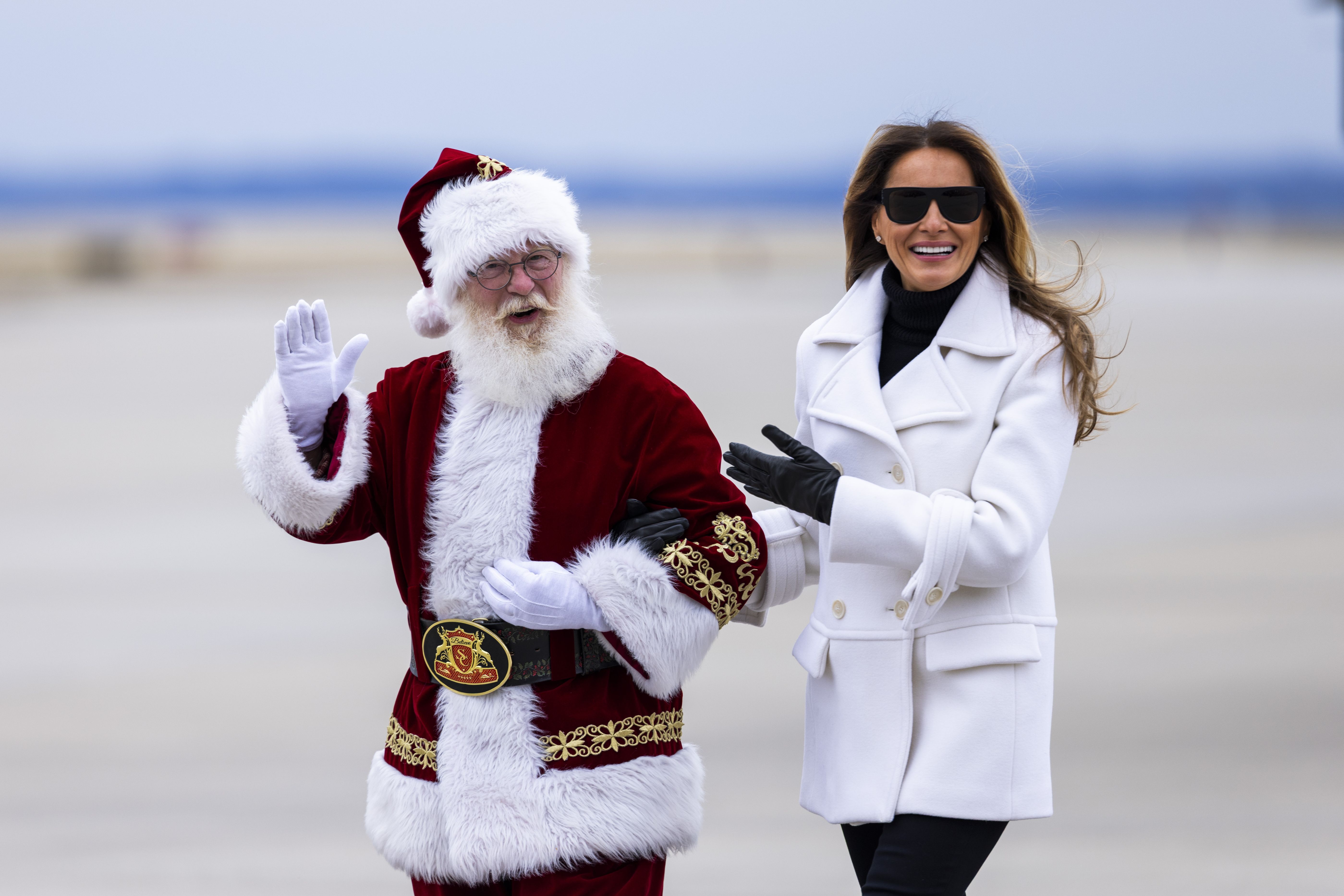 US First Lady Melania Trump and Santa Claus arrive at Marine Corps Base Quantico as the two partner for a Toys for Tots charity drive in Quantico, Virginia, USA, 08 December 2025. In attendance were 150 children of military families. (Photo by Jim Lo Scalzo/EPA)