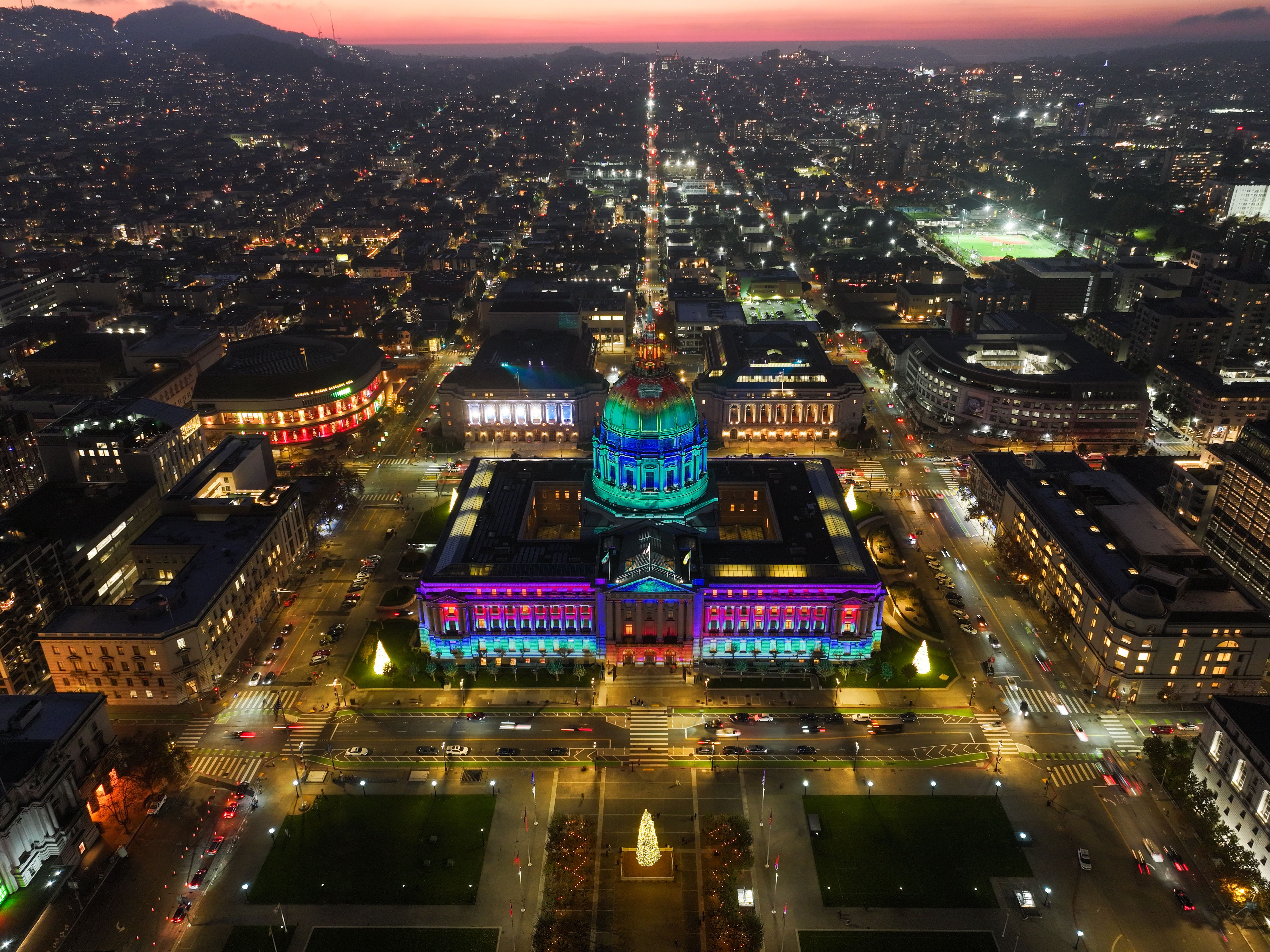 A view of illuminated holiday lights on the City Hall of San Francisco in California, United States on December 8, 2025. (Photo by Tayfun Coskun/Anadolu via Getty Images)