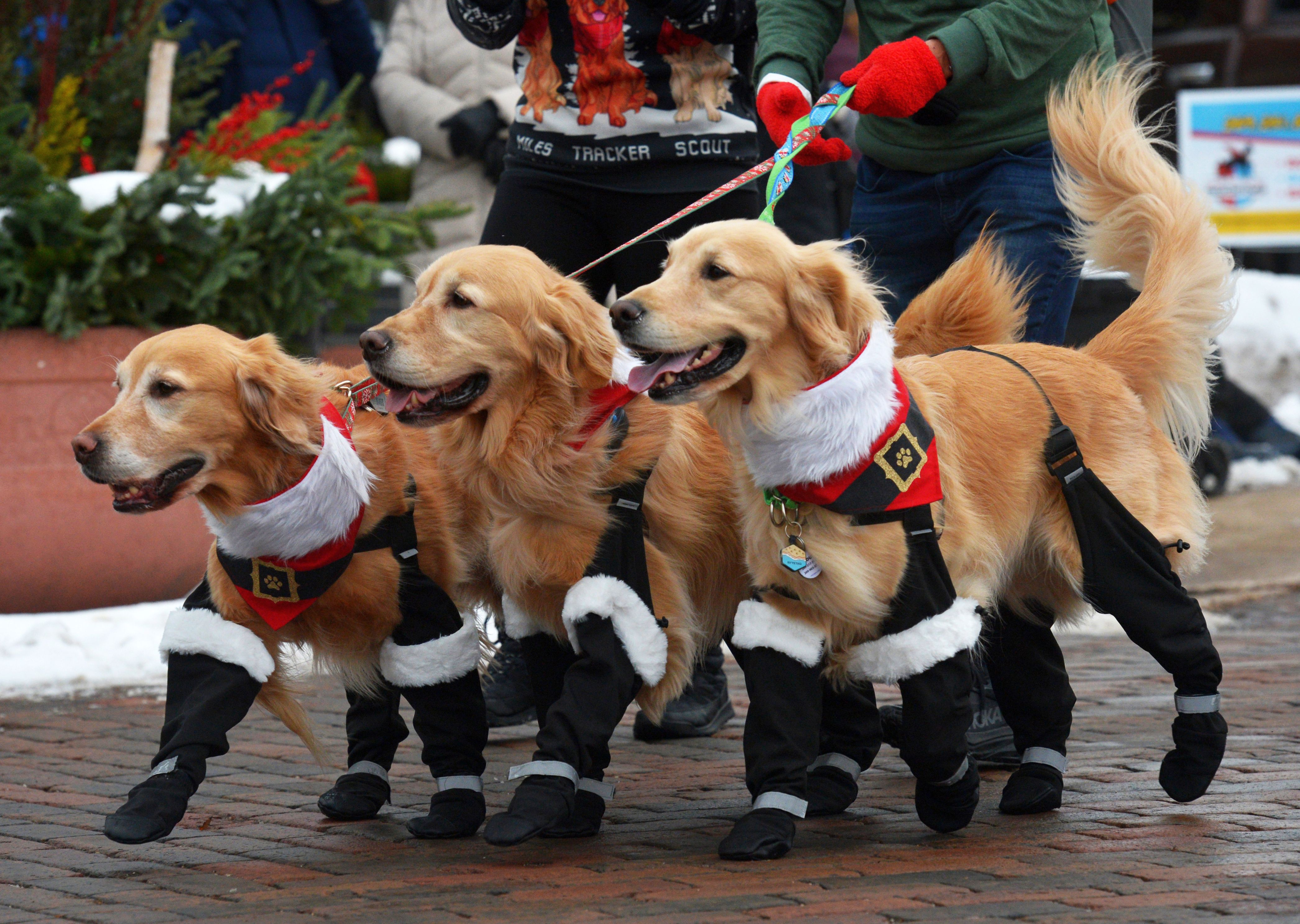 Rachel Roach, of Battle Creek, Mich., and her Golden Retrievers gather during the annual Reindog Parade in downtown St. Joseph, Mich., Saturday, December 6, 2025. (Photo by Don Campbell/The Herald-Palladium via AP Photo)