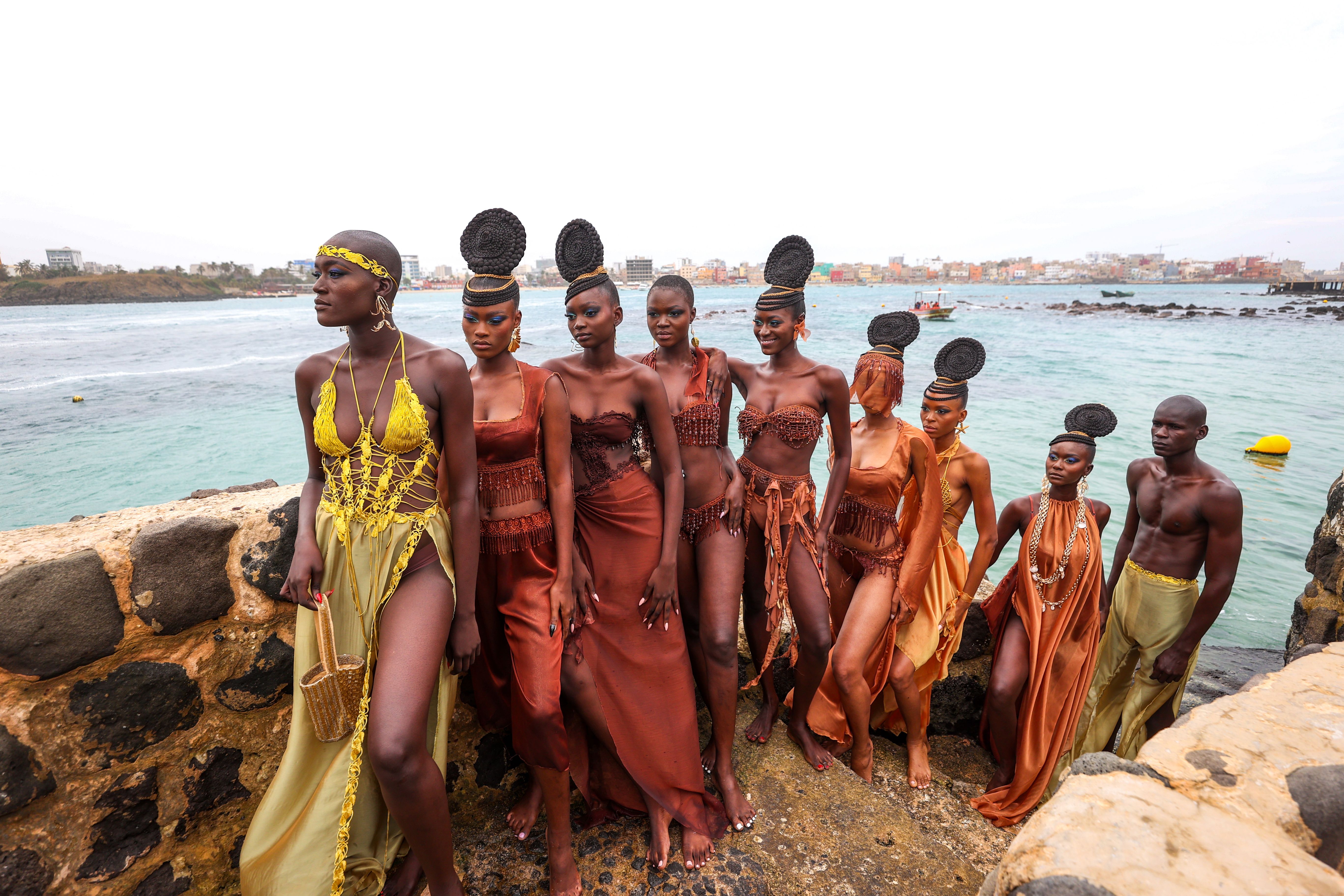 Models showcase designs aboard fishing boats off Ngor Island during the 23rd Dakar Fashion Week, organized by Senegalese-French designer Adama N'Diaye, founder of the brand “Adama Paris”, on December 6, 2025, in Dakar, Senegal. (Photo by Cem Ozdel/Anadolu via Getty Images)