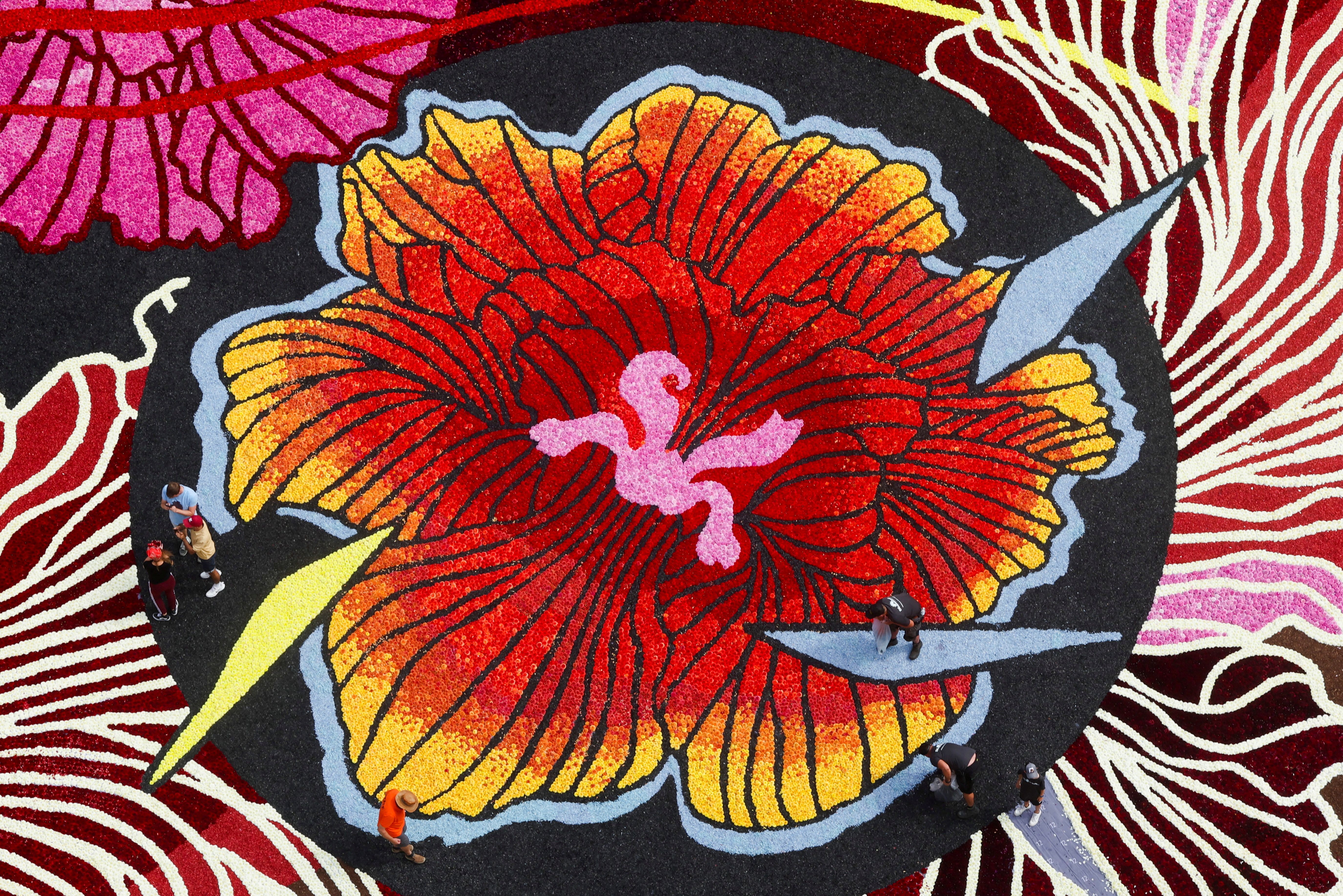 A 1,680-square-meter “Art Nouveau” theme flower carpet, made by a team of about 100 gardeners using hundreds of thousands of dahlias and begonias, is seen at Brussels' Grand Place, Belgium on August 15, 2024. (Photo by Yves Herman/Reuters)