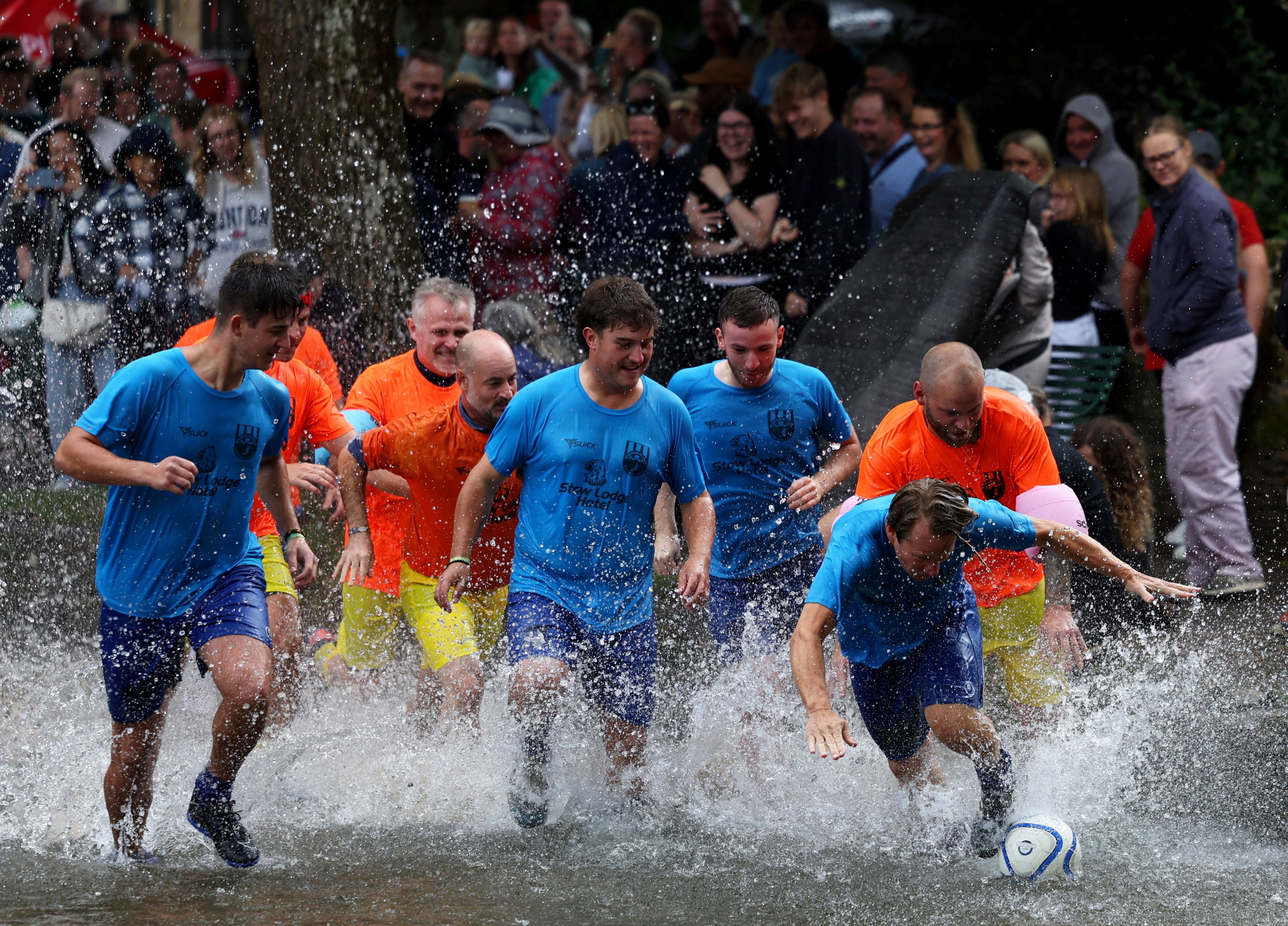 People compete in the annual football match in the River Windrush in Bourton-on-the-Water, Gloucestershire, Britain, on August 26, 2024. (Photo by Lee Smith/Reuters)