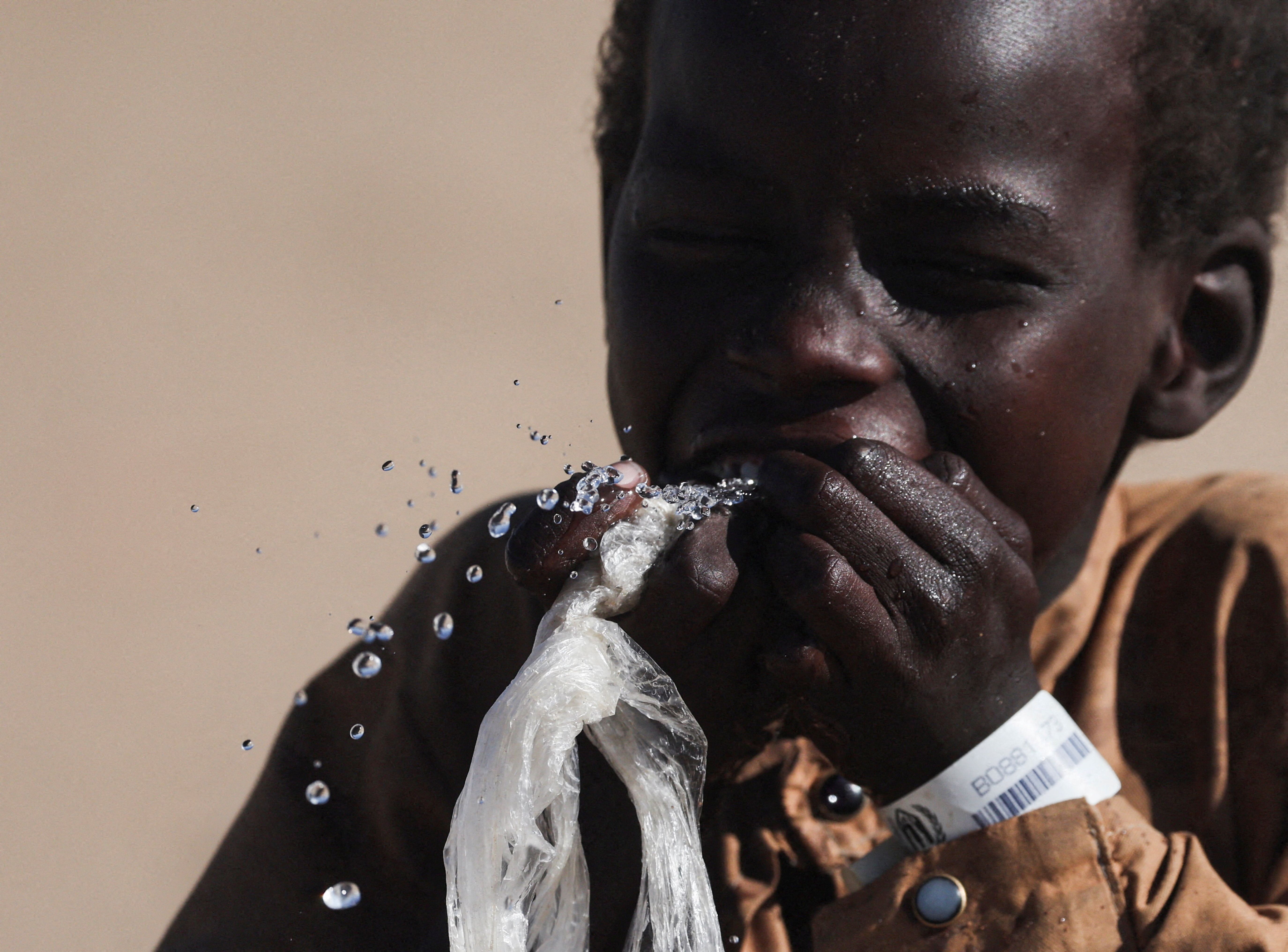 A Sudanese refugee boy from al-Fashir drinks water at the Tine transit refugee camp, amid the conflict between the paramilitary Rapid Support Forces (RSF) and the Sudanese army, in eastern Chad, on November 23, 2025. (Photo by Amr Abdallah Dalsh/Reuters)