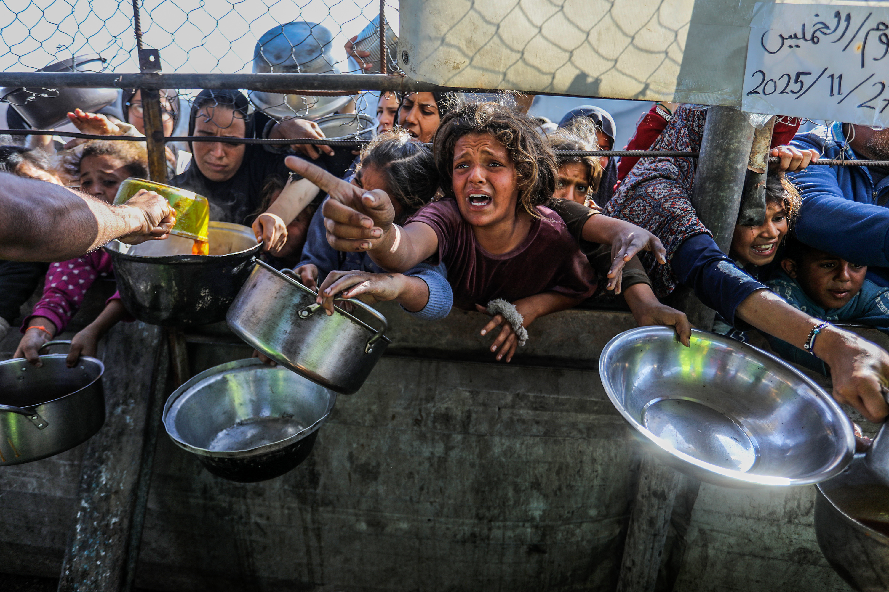 Palestinians in the al-Mawasi area of Khan Yunis in southern Gaza receive hot meals from a charity for those displaced by Israeli attacks, while a large crowd, including women and children, gathers during the distribution, on November 27, 2025. (Photo by Abed Rahim Khatib/Anadolu via Getty Images)