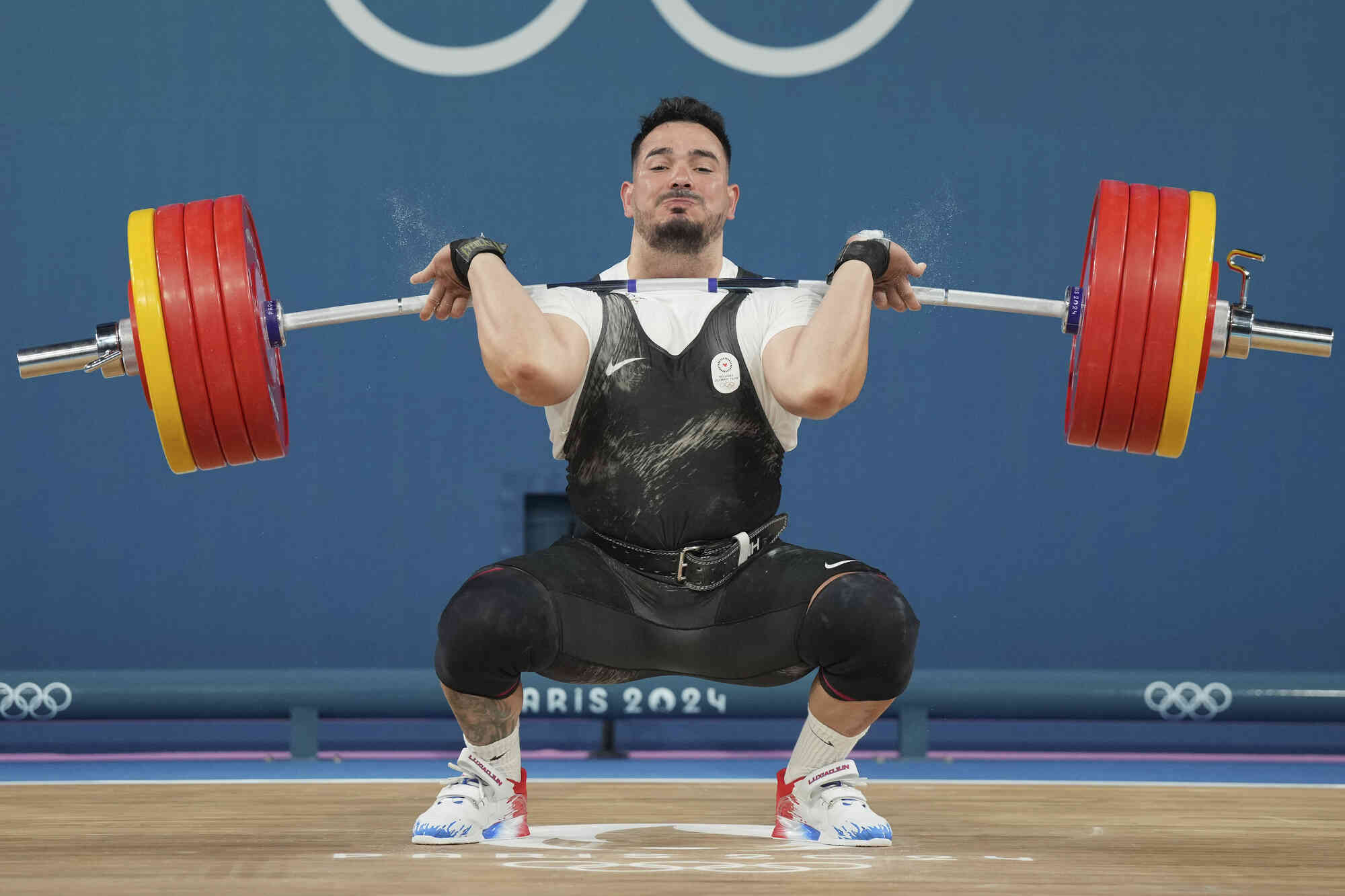Ramiro Mora Romero of Refugee Olympic Team competes during the men's 102kg weightlifting event, at the 2024 Summer Olympics, Saturday, August 10, 2024, in Paris, France. (Photo by Kin Cheung/AP Photo)
