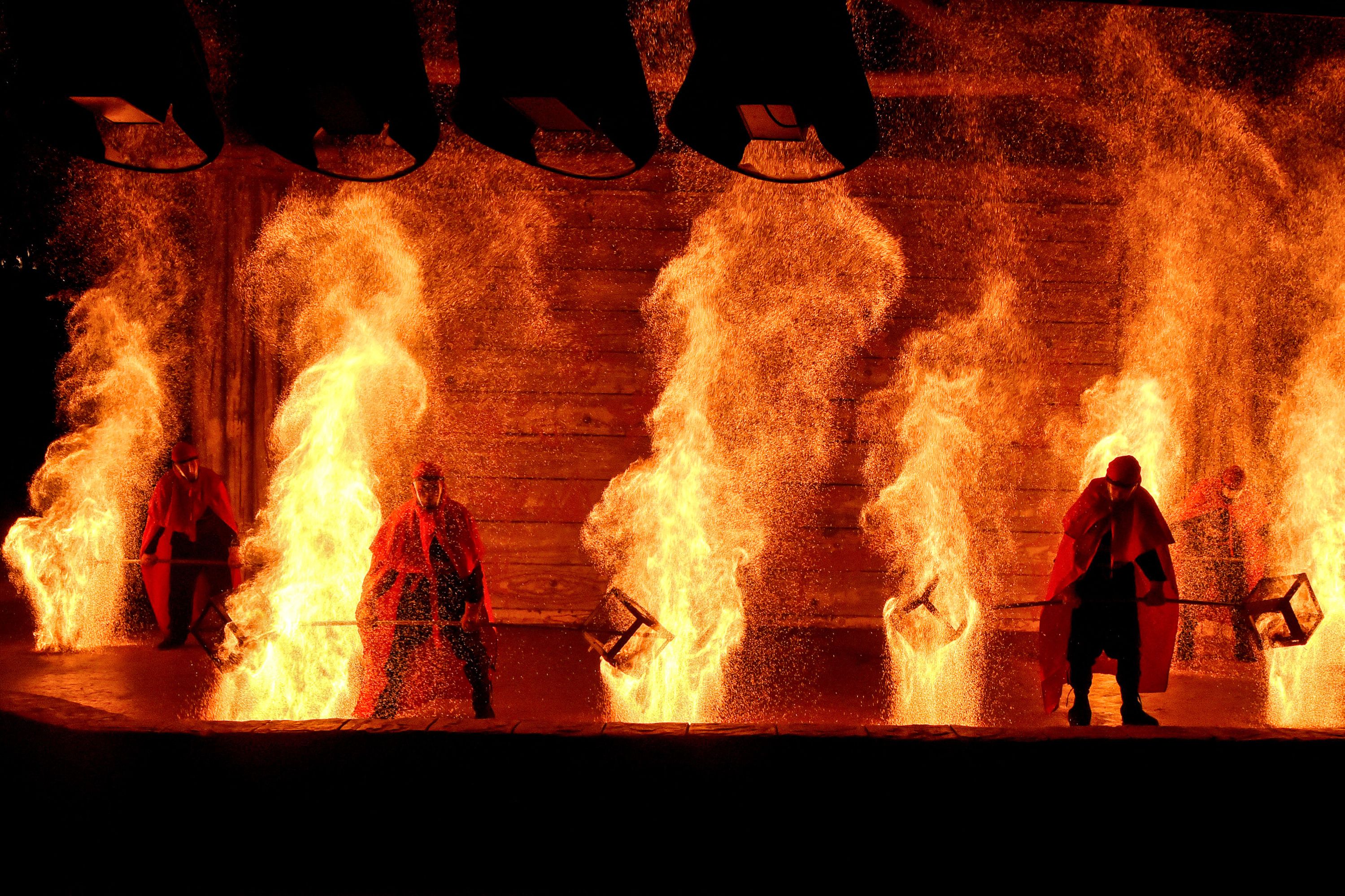 The photo taken on August 1, 2024 shows performers shaking iron nets with burning charcoal to create sparks in a traditional Chinese “fire kettle” performance in Handan, in northern China's Hebei province. (Photo by AFP Photo/China Stringer Network)