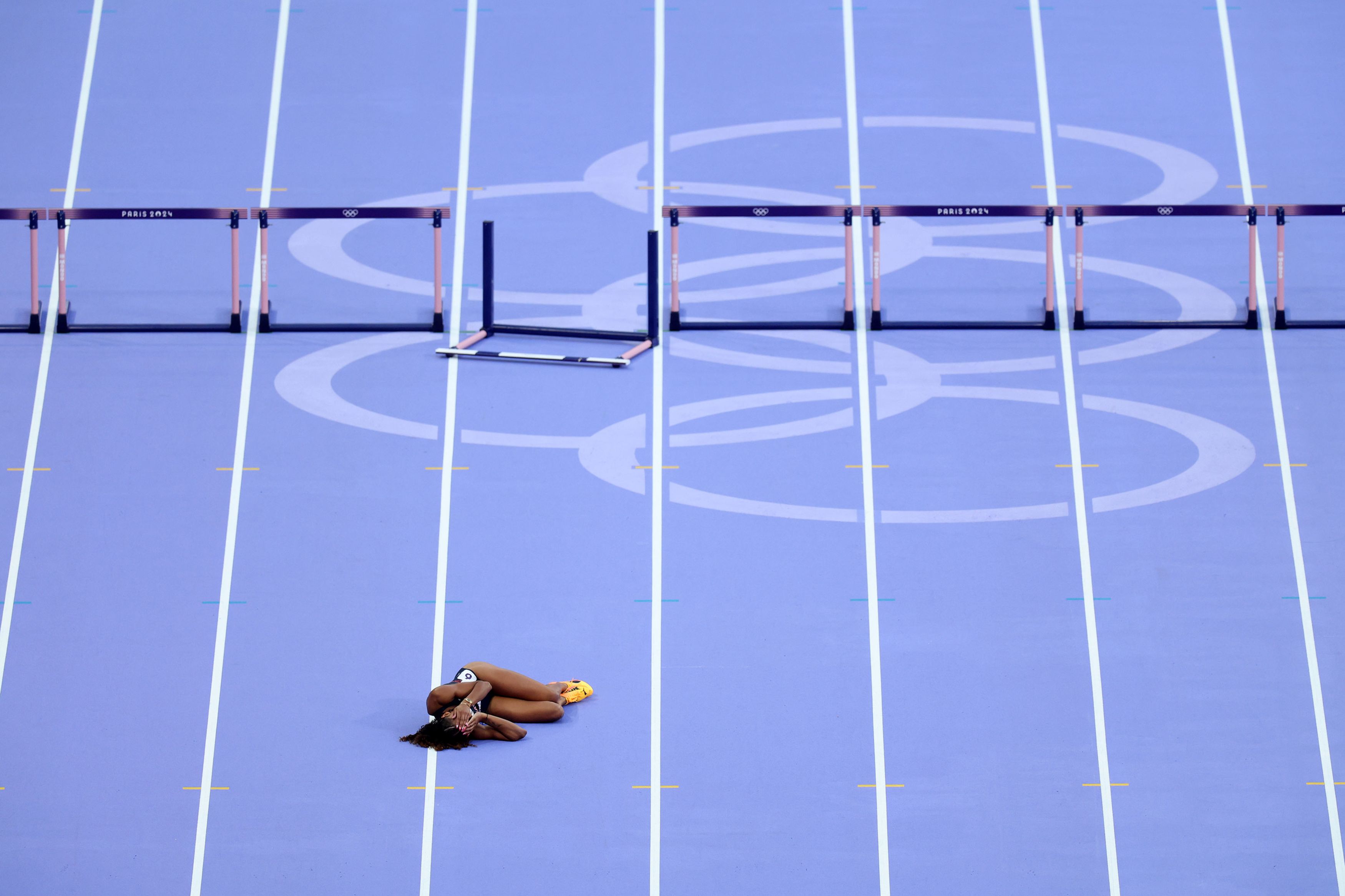 Lina Nielsen of Team Great Britain reacts after falling down during the Women's 400m Hurdles Semi-Final on day eleven of the Olympic Games Paris 2024 at Stade de France on August 06, 2024 in Paris, France. (Photo by Justin Setterfield/Getty Images)
