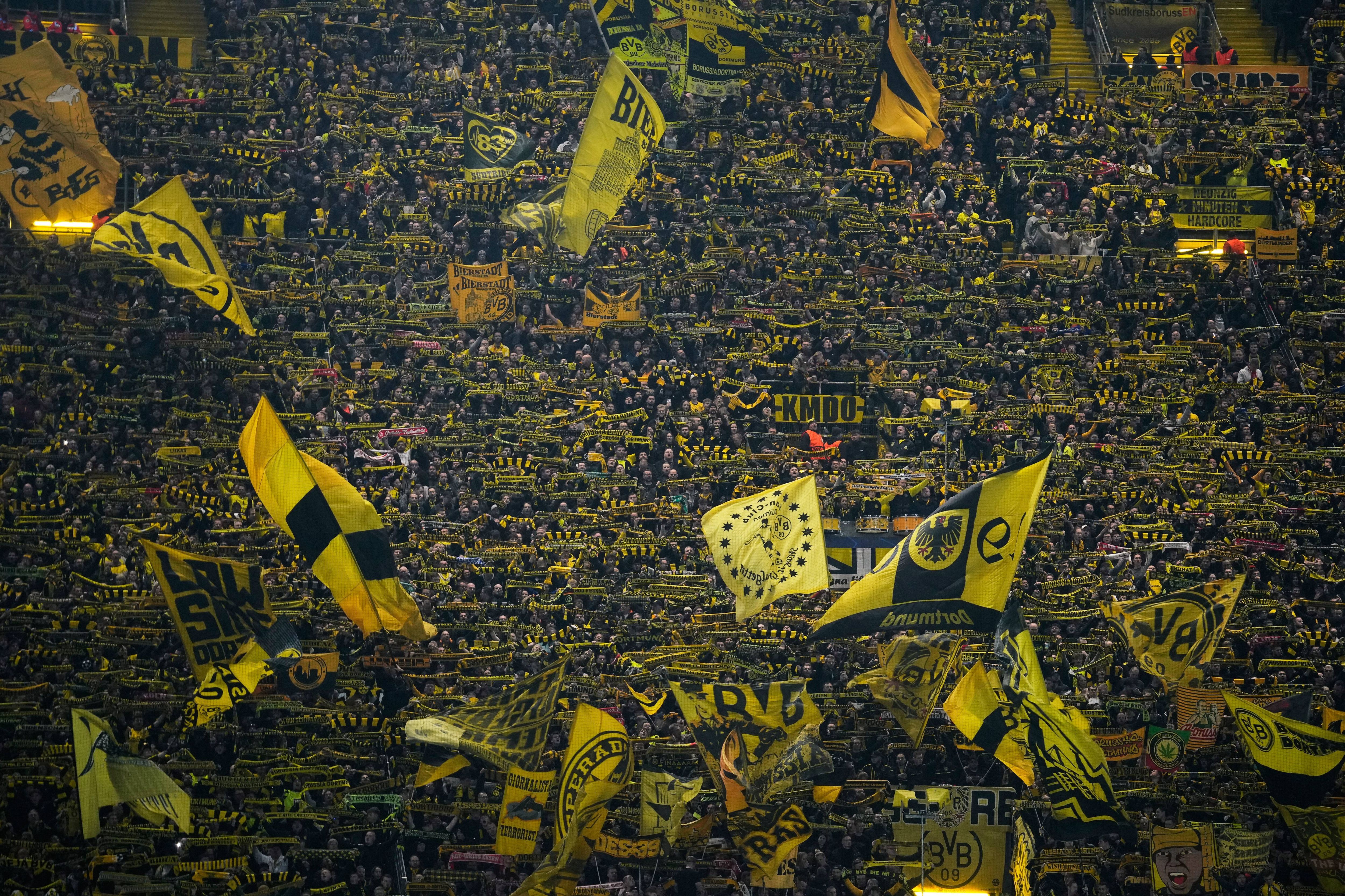 Borussia Dortmund supporters react ahead of the Champions League opening phase soccer match between Borussia Dortmund and Bodo Glimt in Dortmund, Germany, Wednesday, December 10, 2025. (Photo by Ebrahim Noroozi/AP Photo)