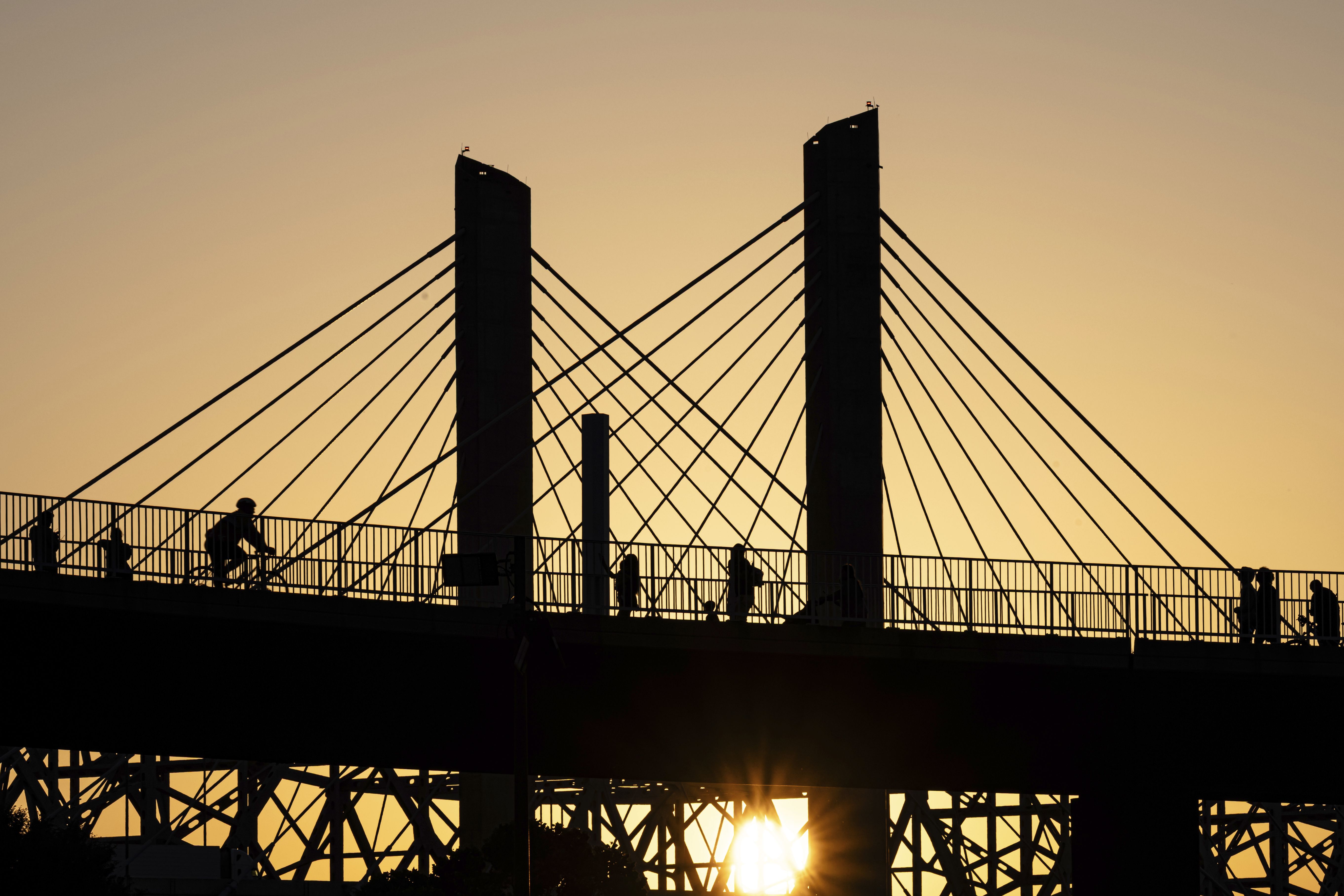 Poeple walk across the Big Four Bridge as the sun sets at Waterfront Park on Sunday, June 22, 2025, in Louisville, Ky. (Photo by Jon Cherry/AP Photo)