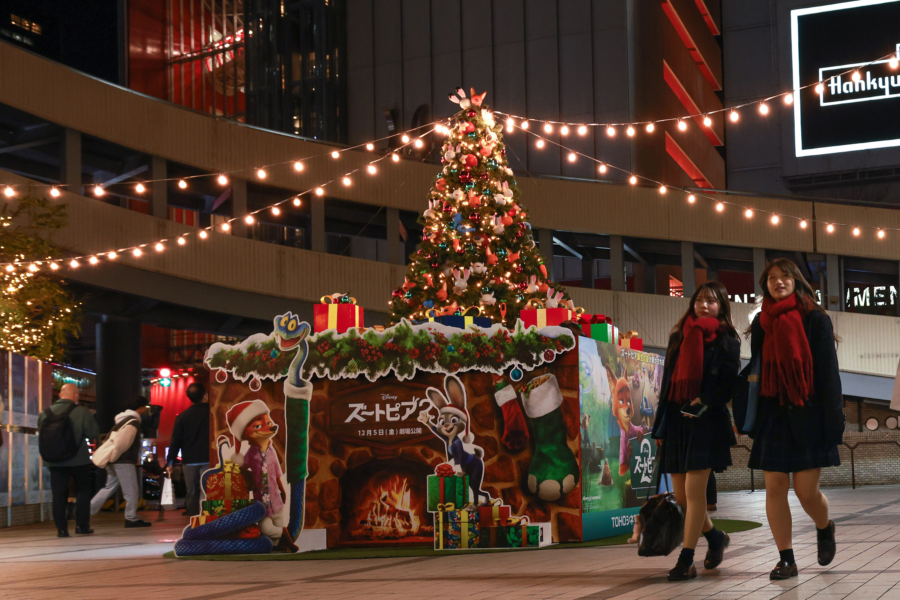 Shoppers walk past a Christmas tree during the Christmas shopping season on December 18, 2025 in Osaka, Japan. (Photo by Buddhika Weerasinghe/Getty Images)