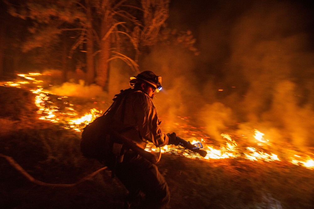 A Cal Fire firefighter tackles the Bridge Fire threatening mountain communities to the northeast of Los Angeles, in Wrightwood, California, on September 11, 2024. (Photo by Ringo Chiu/Reuters)