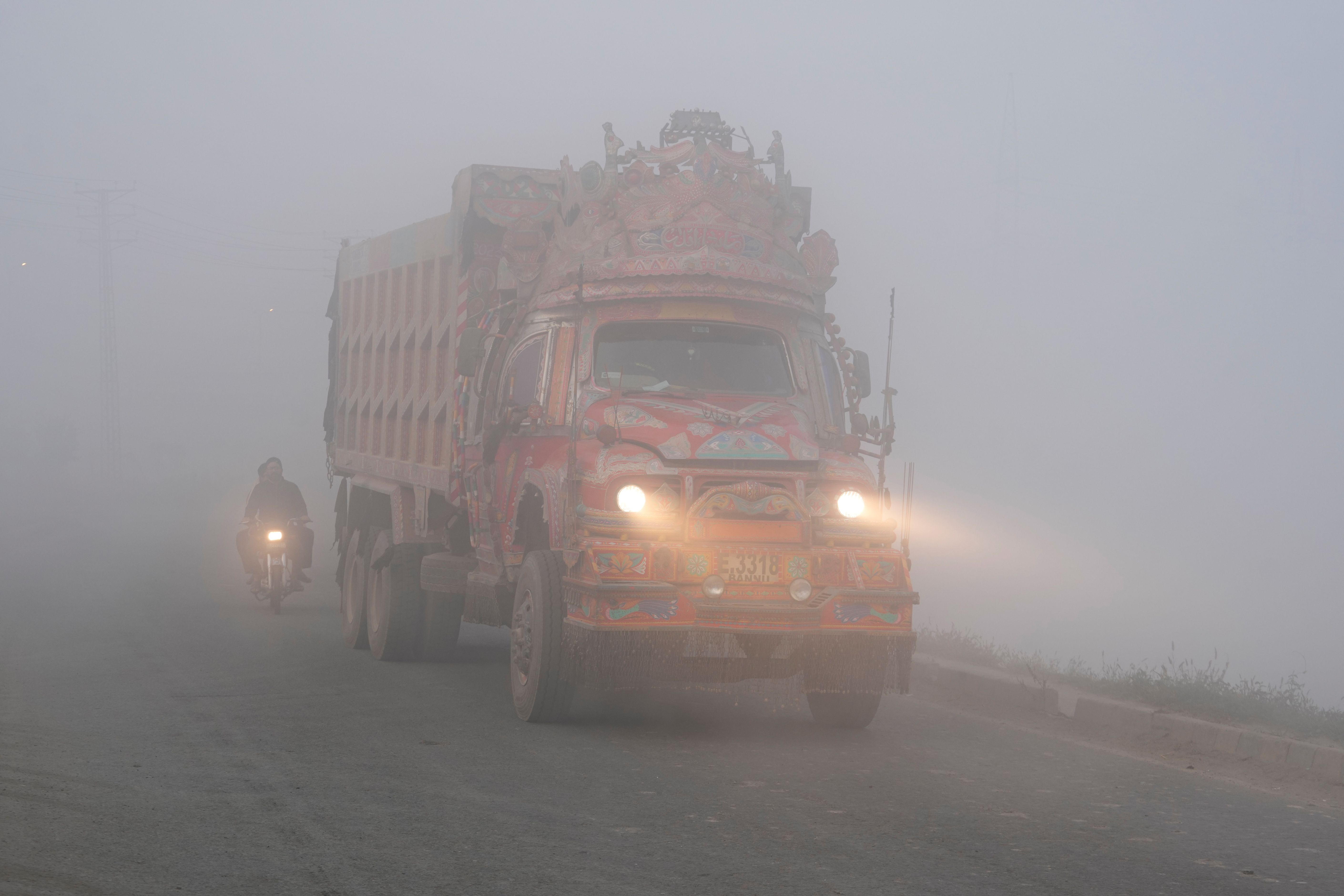 A truck moves with lights on due to smog enveloping the area of Lahore, Pakistan, Friday, October 31, 2025. (Photo by K.M. Chaudary/AP Photo)