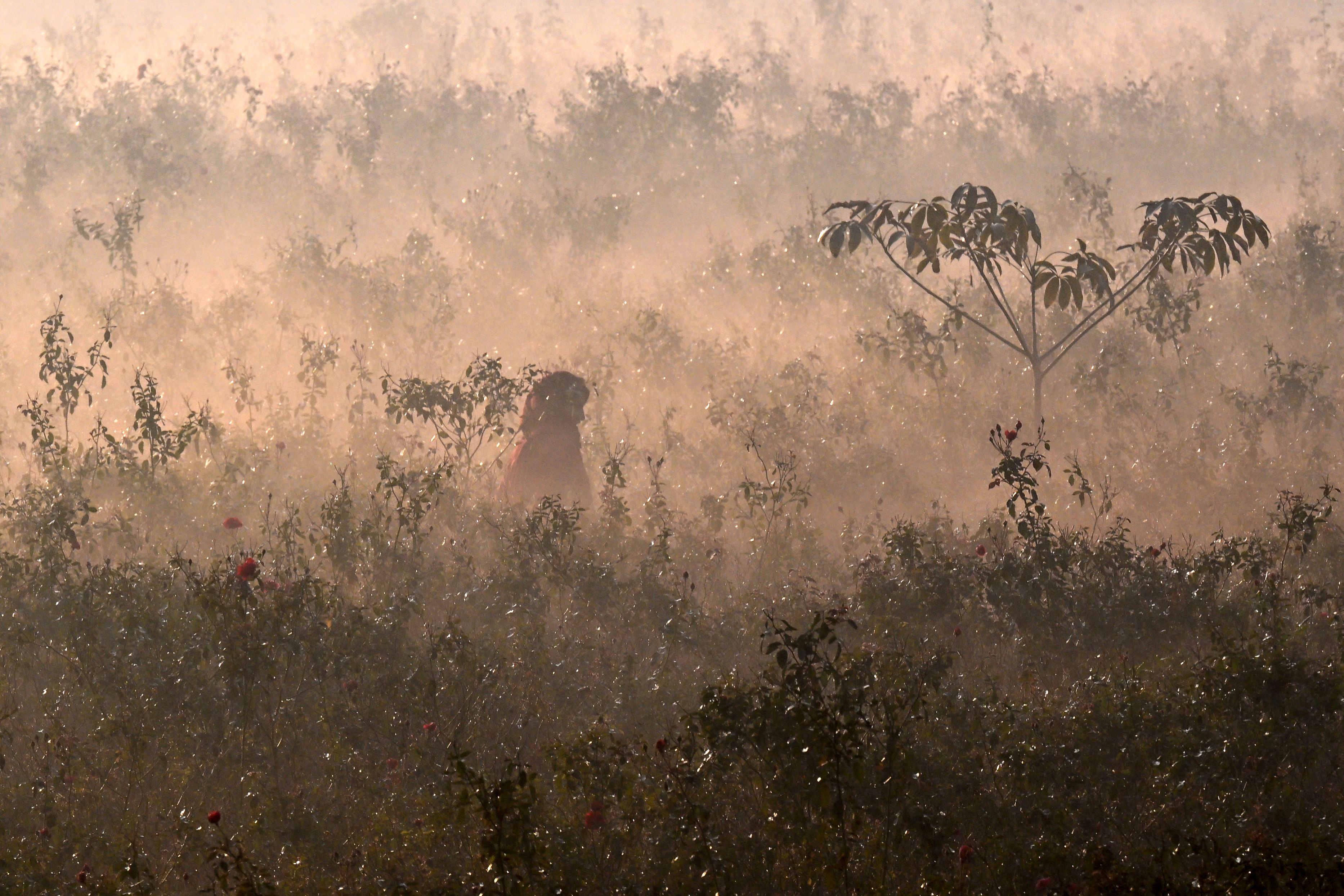 A woman plucks roses at a field amid dense smog in Lahore on December 8, 2025. (Photo by Arif Ali/AFP via Getty Images)