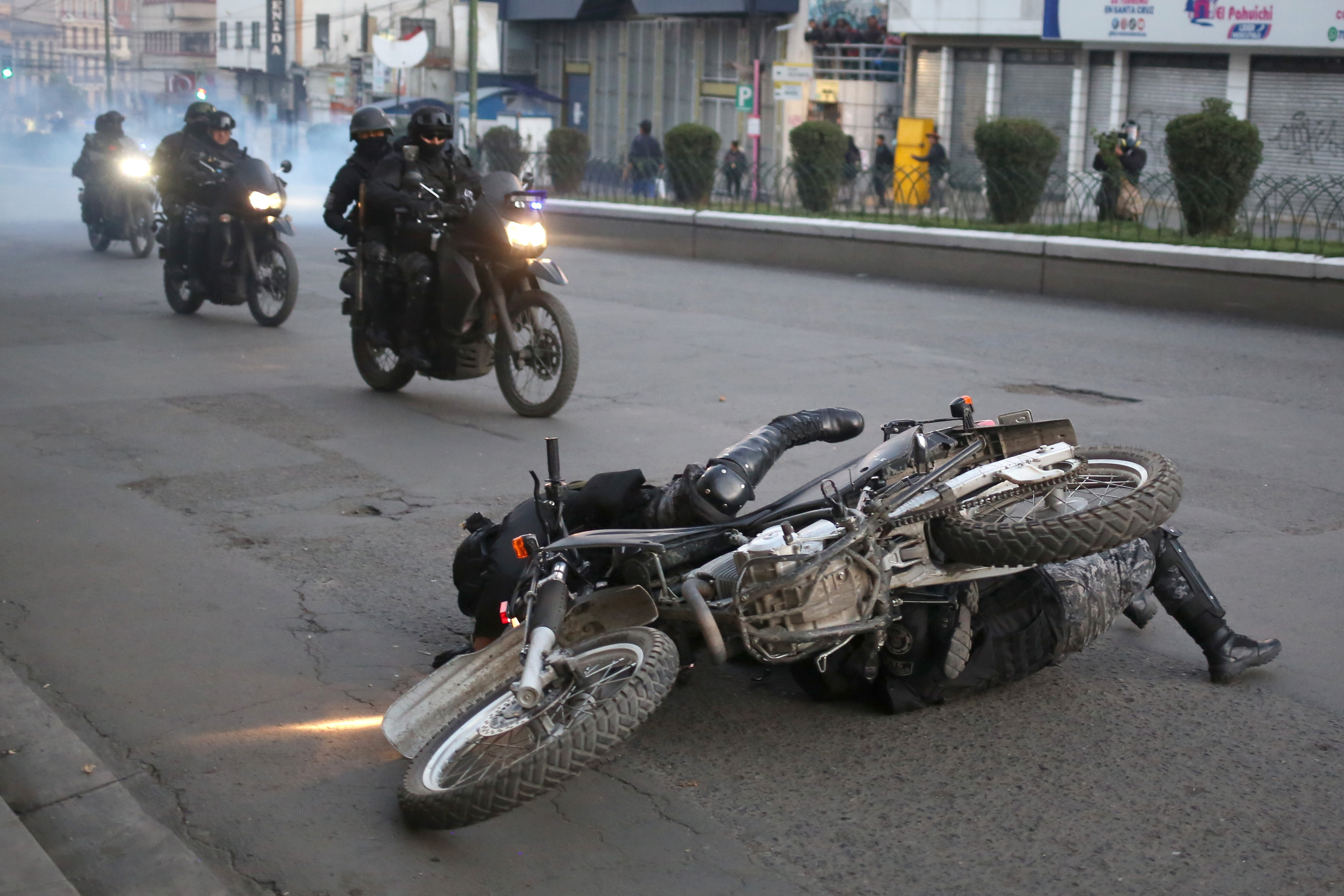 Riot police officers fall off a motorcycle during clashes between supporters of Bolivian President Luis Arce and pro-government leader Evo Morales in La Paz, Bolivia, 23 September 2024. Supporters of former Bolivian President Evo Morales asked the electoral body to recognize the congress in which they defined the candidacy of the former president in the 2025 elections, threatening with national road blockade upon denial. On 23 September, Morales gave an ultimatum to President Luis Arce, demanding to change his ministers within 24 hours if he wanted to finish his term in office. (Photo by Luis Gandarillas/EPA/EFE)