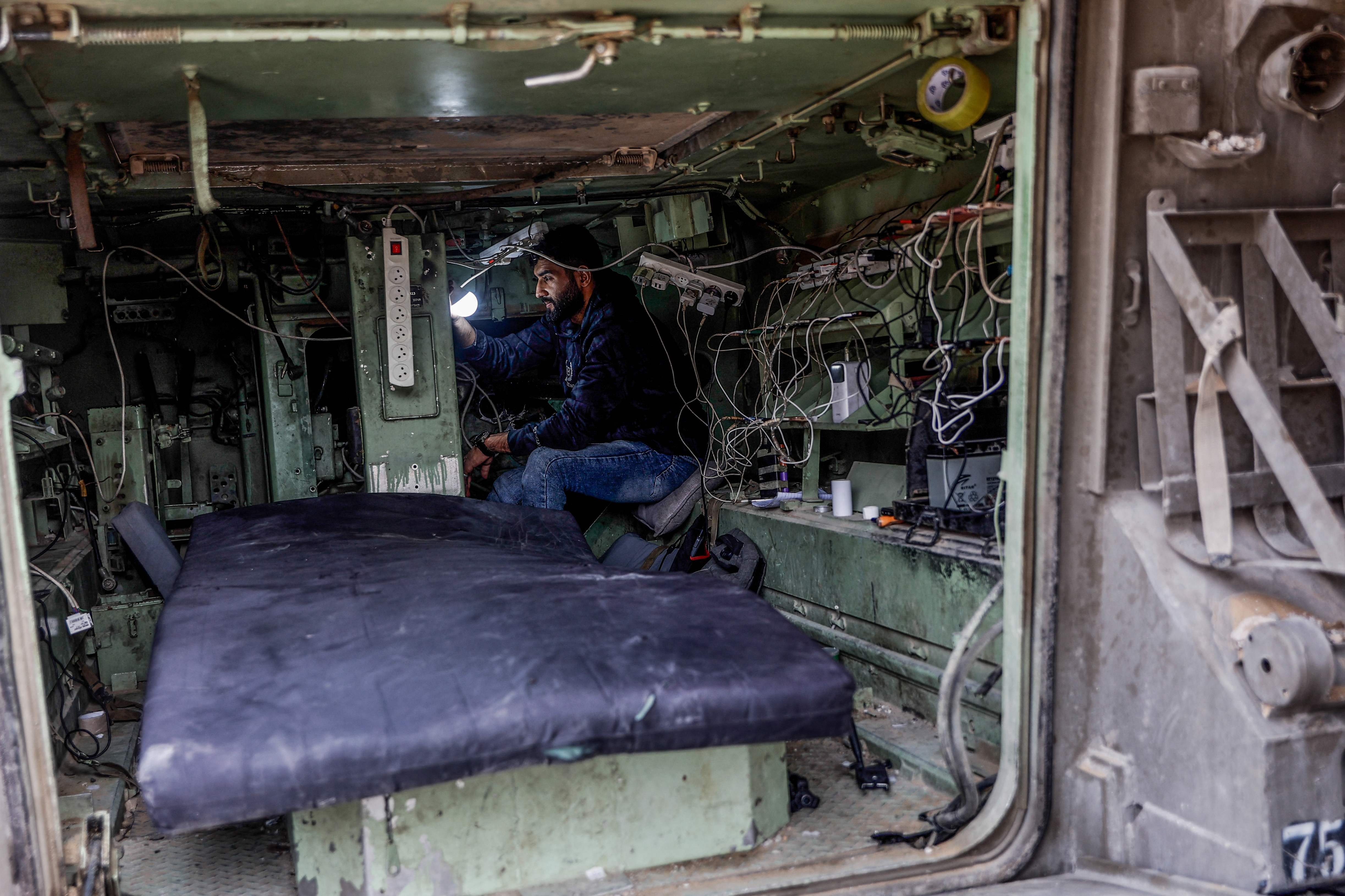 Yahya Akhzeiq, 27-years-old, connects a mobile phone to a charger as he sits in a converted Israeli military vehicle abandoned by the Israeli army and now used by the mainly displaced Palestinian communities as a charging point for mobiles and laptops, in Tel al-Hawa neighborhood, in the southern part of Gaza City on November 29, 2025. Brothers Yahya and Akram Akhzeiq, have set-up a charging point using solar-energy panels placed on the exterior the vehicle's hull, which sits under the concreate of a destroyed building. The majority of Gaza's 2.4 million people have been displaced, often multiple times, by the war that began with Hamas's attack on southern Israel on October 7, 2023. With many displaced living in tent camps, the coming winter is raising serious concerns. (Photo by Omar Al-Qattaa/AFP Photo)