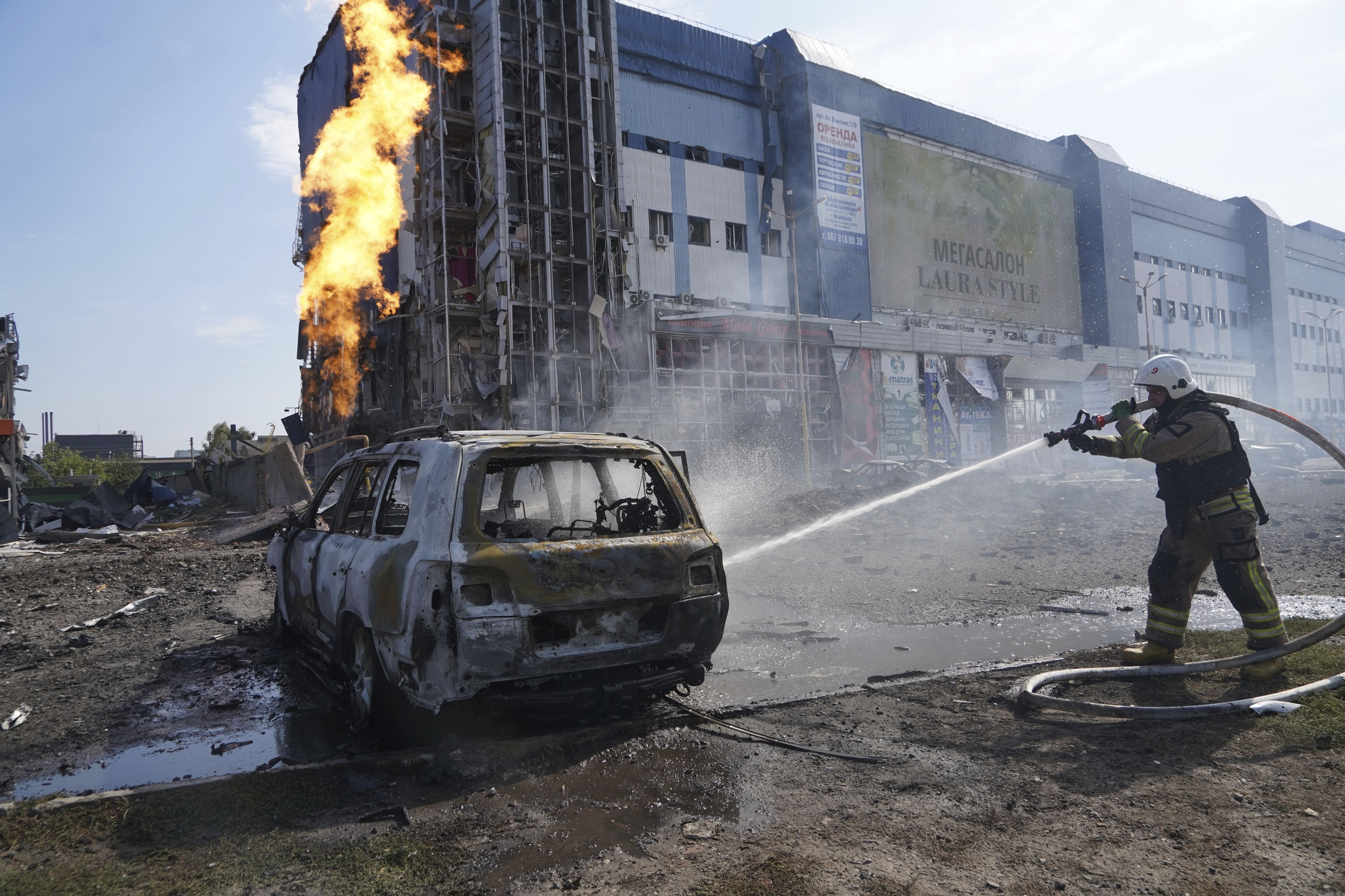 Firefighters extinguish the fire after a Russian missile attack in Kharkiv, Ukraine, Sunday, September 1, 2024. (Photo by Andrii Marienko/AP Photo)
