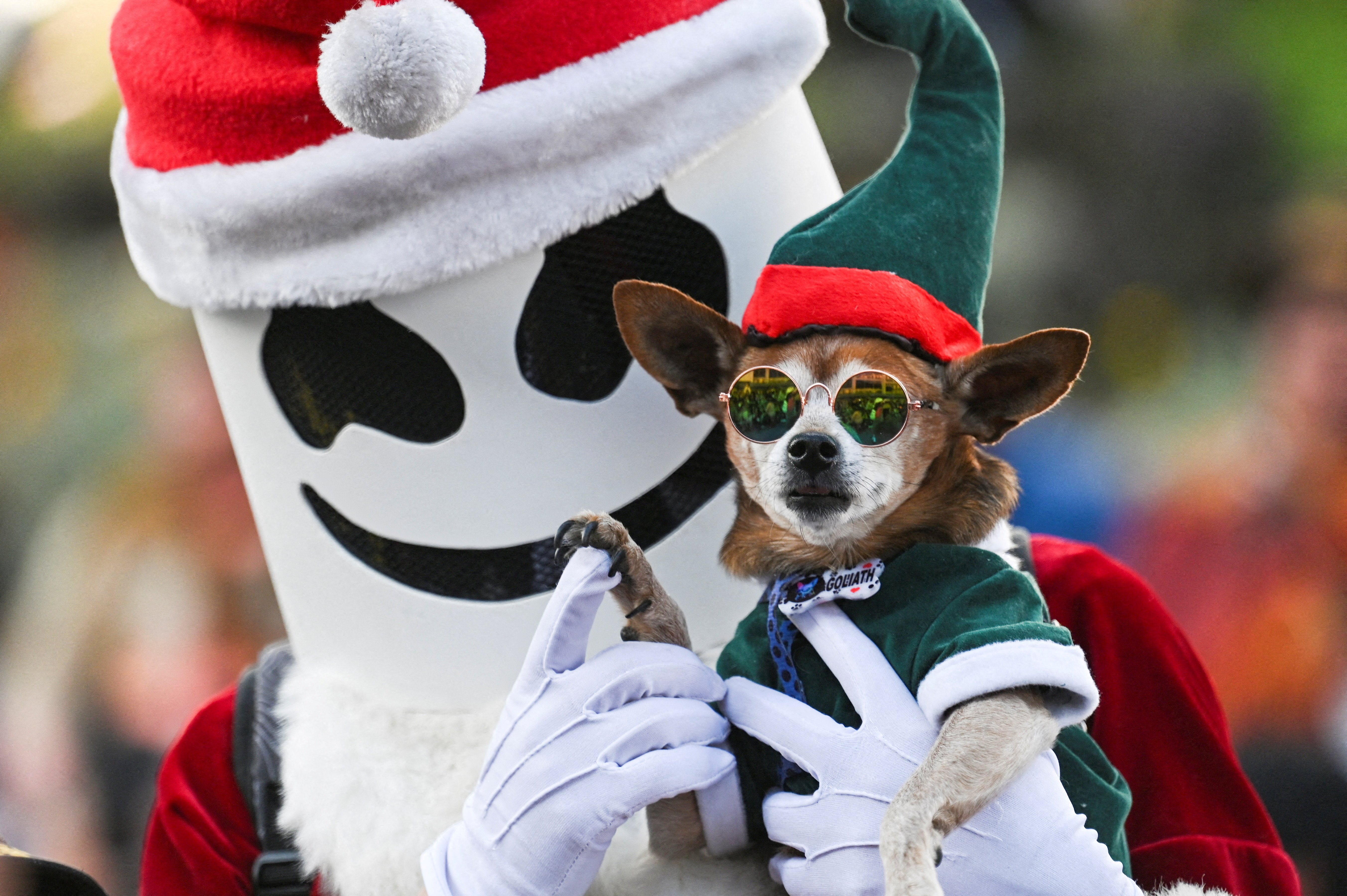 A dog dressed in a Christmas costume takes part in a parade as part of a festive tradition, in La Paz, Bolivia, on December 13, 2025. (Photo by Claudia Morales/Reuters)