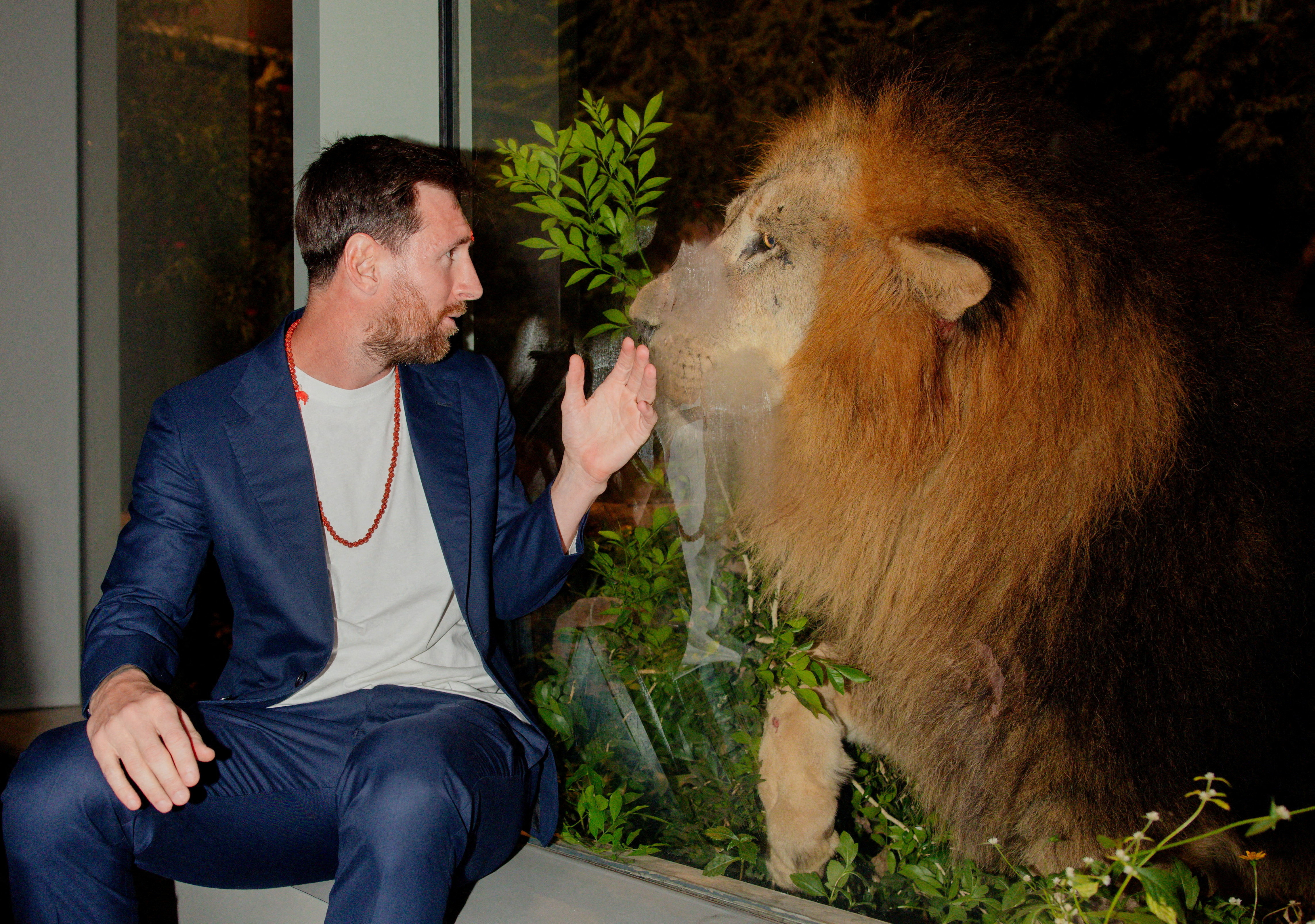 Argentina and Inter Miami's Lionel Messi sits next to a lion in a enclosure at Vantara animal rescue and rehabilitation centre in Jamnagar, Gujarat, India, on December 15, 2025. (Photo by Vantara/Handout/Reuters)