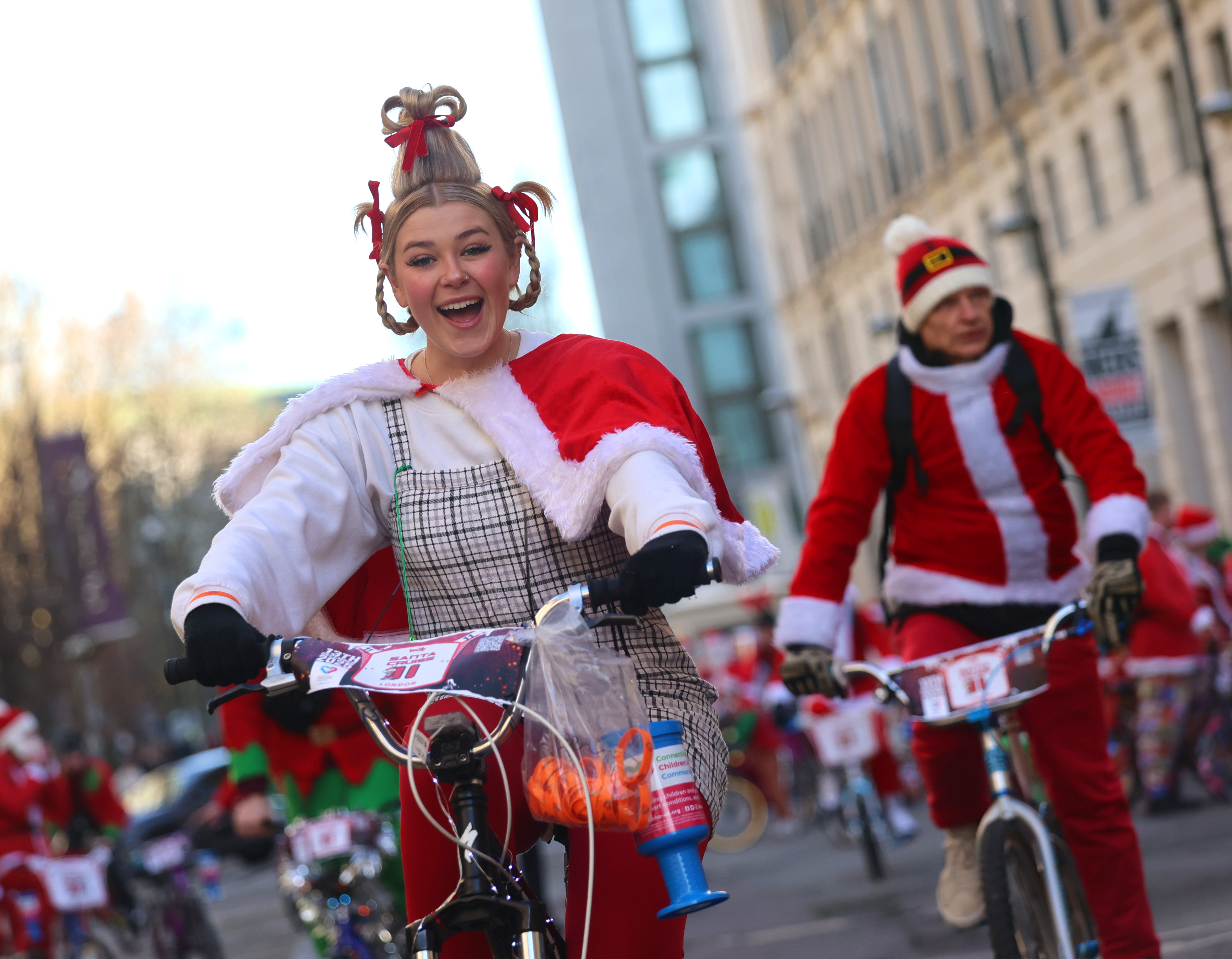 The 11th BMX Life's Santa Cruise in aid of the ECHO Charity where hundreds of riders dress in Christmas fancy dress and ride their BMX bicycles through central London on December 14, 2025. (Photo by Peter Tarry for the Times)