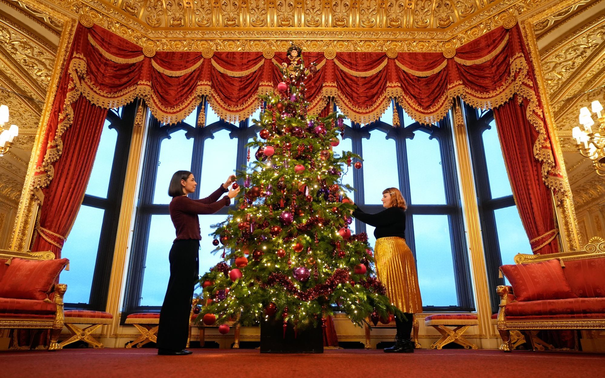 Royal Collection Trust staff add the finishing touches to a Christmas tree in the Crimson Drawing room, during a photo call for Christmas decorations at Windsor Castle, Berkshire, UK, ahead of the festive season on Thursday, November 27, 2025. (Photo by Andrew Matthews/PA Images via Getty Images)