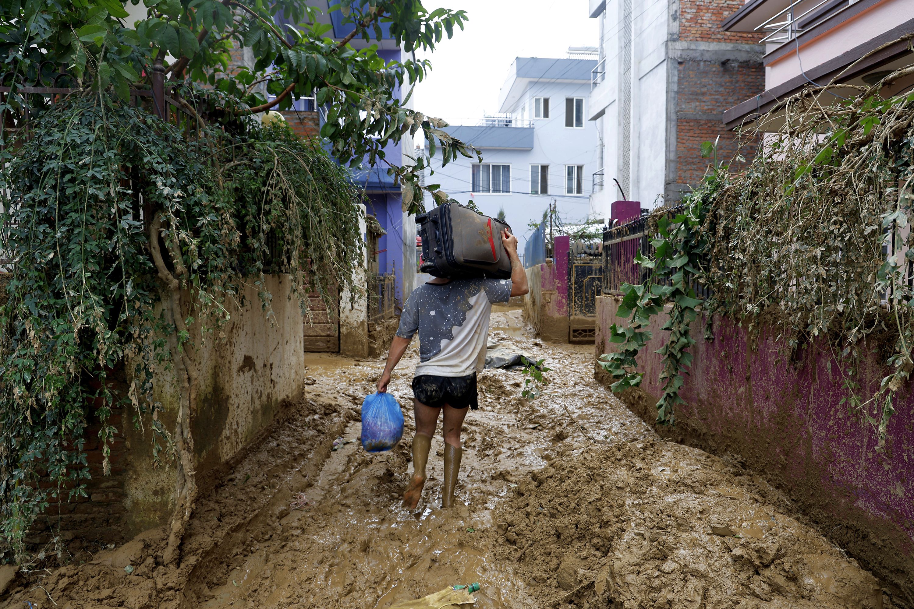 A man walks on a muddy alleyway carrying belongings salvaged from his house in Kathmandu, Nepal, Monday, September 30, 2024 in the aftermath of a flood caused by heavy rains. (Photo by Gopen Rai/AP Photo)