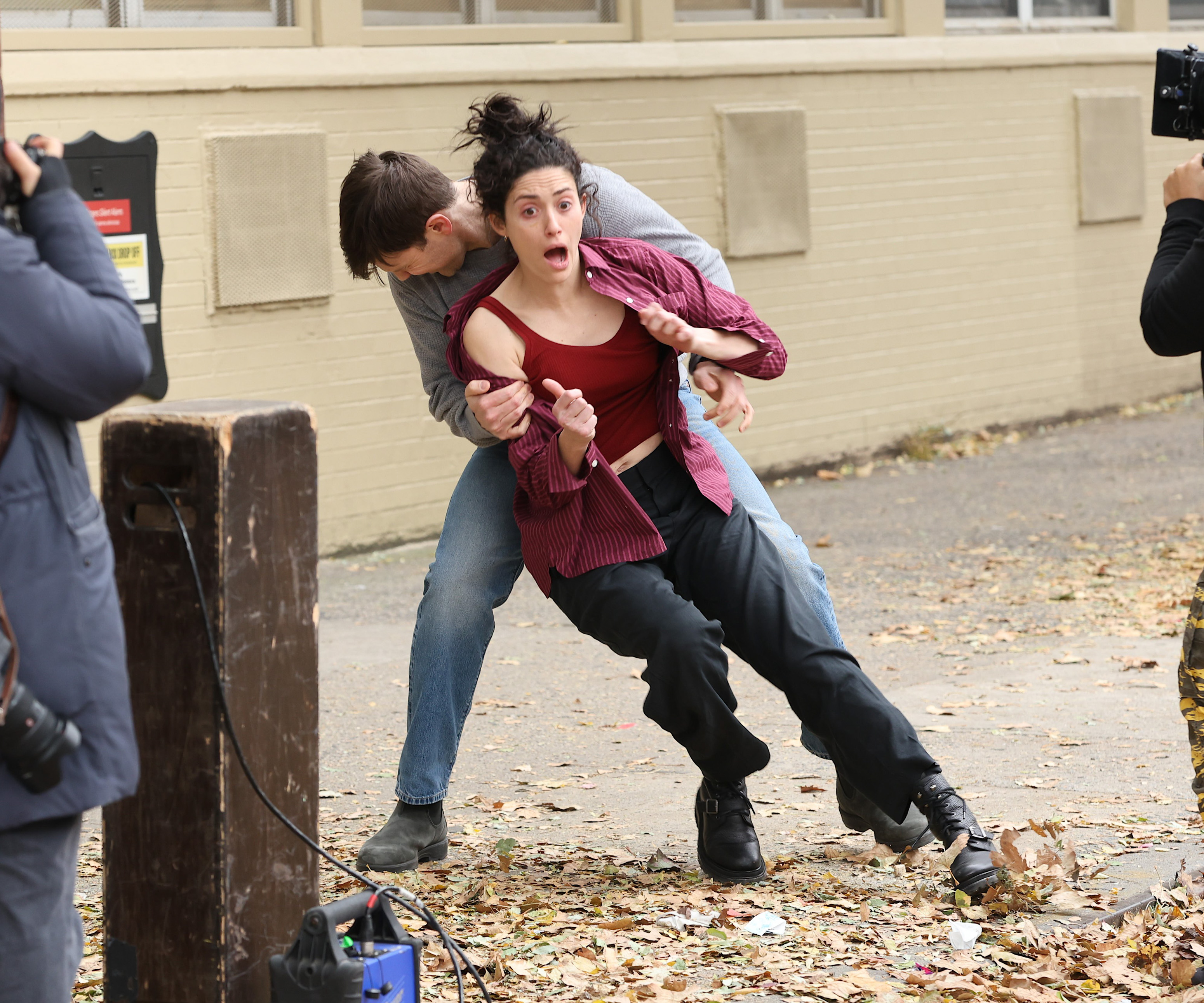 Emmy Rossum and Jake Lacy are seen on set of the “Furious” TV Series on November 12, 2025 in New York City. (Photo by Jose Perez/Bauer-Griffin/GC Images)