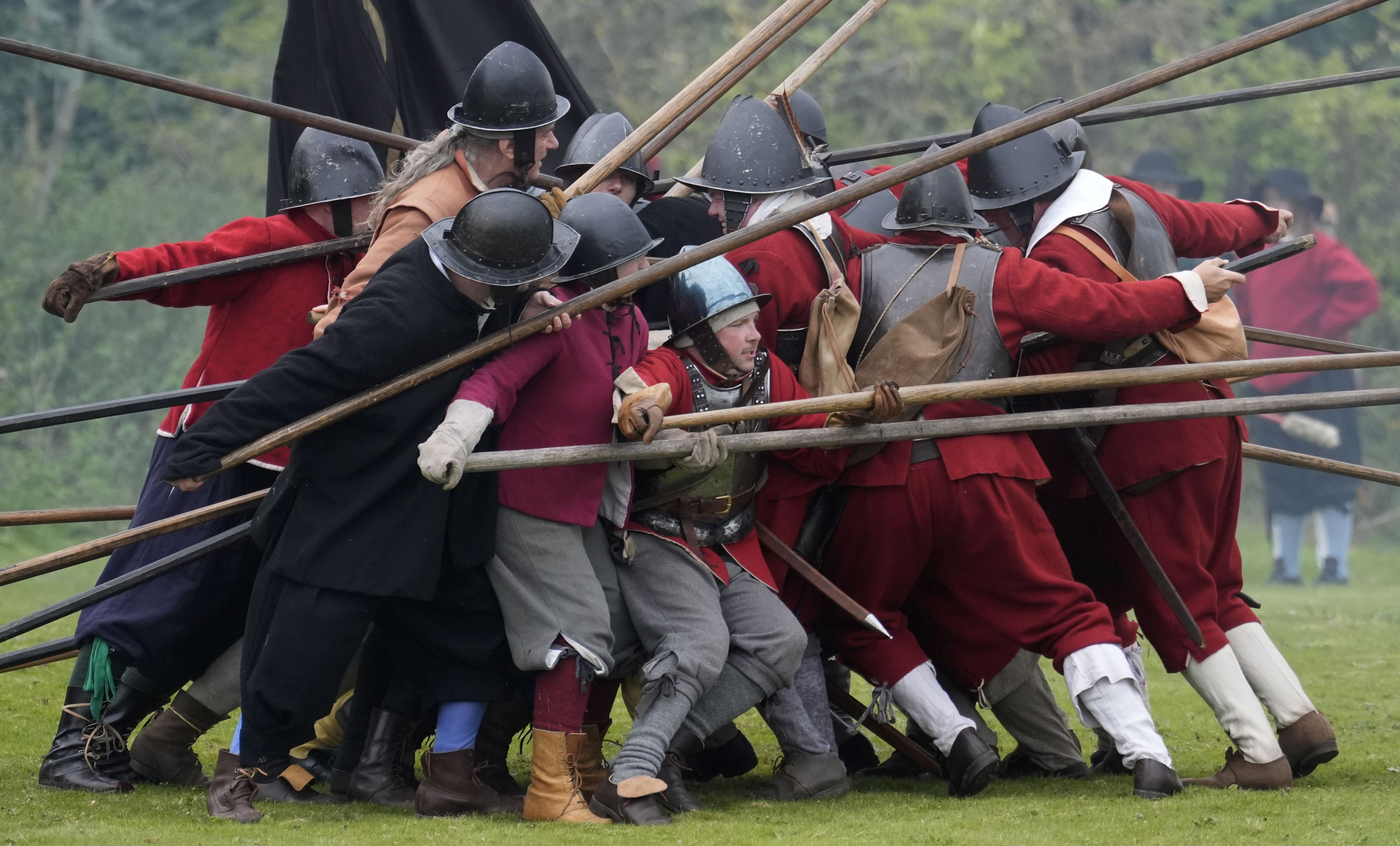 Members of the English Civil War re-enactment group, The Marquess of Winchester's Regiment, take part in a “skirmish” during the English Civil War re-enactment weekend at Basing House in Basingstoke, Hampshire, UK on Sunday, September 15, 2024. (Photo by Andrew Matthews/PA Images via Getty Images)