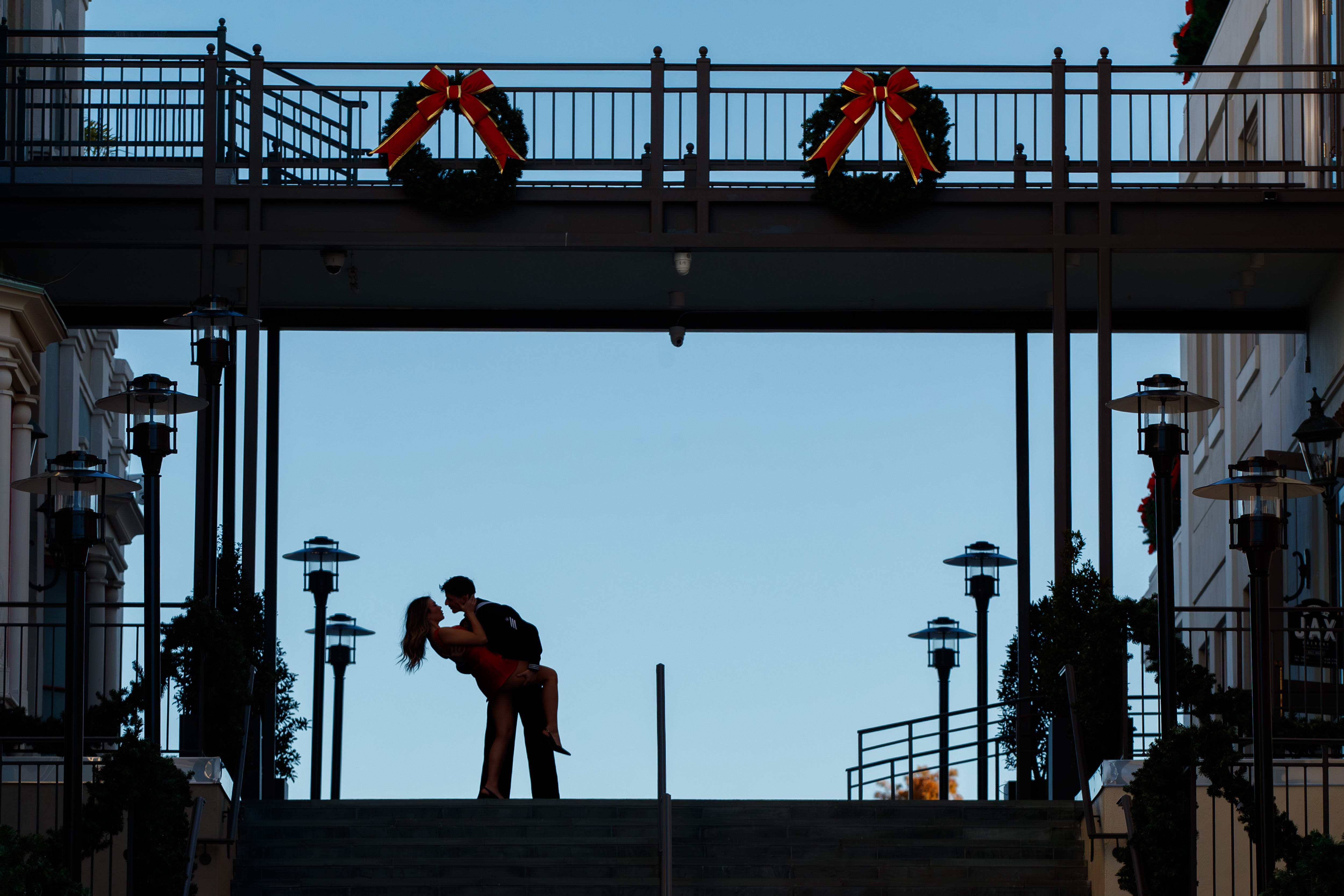 Love is in the brisk air on their one year wedding anniversary, Mason Diemer, right, who is stationed at the Belle Chasse Navel Air Station, kisses his wife, Chanelle, both from Washington state, at the top of the steps at Jax Brewery in the French Quarter, Tuesday, December 9, 2025, in New Orleans. (Photo by David Grunfeld/The Times-Picayune/The New Orleans Advocate via AP Photo)