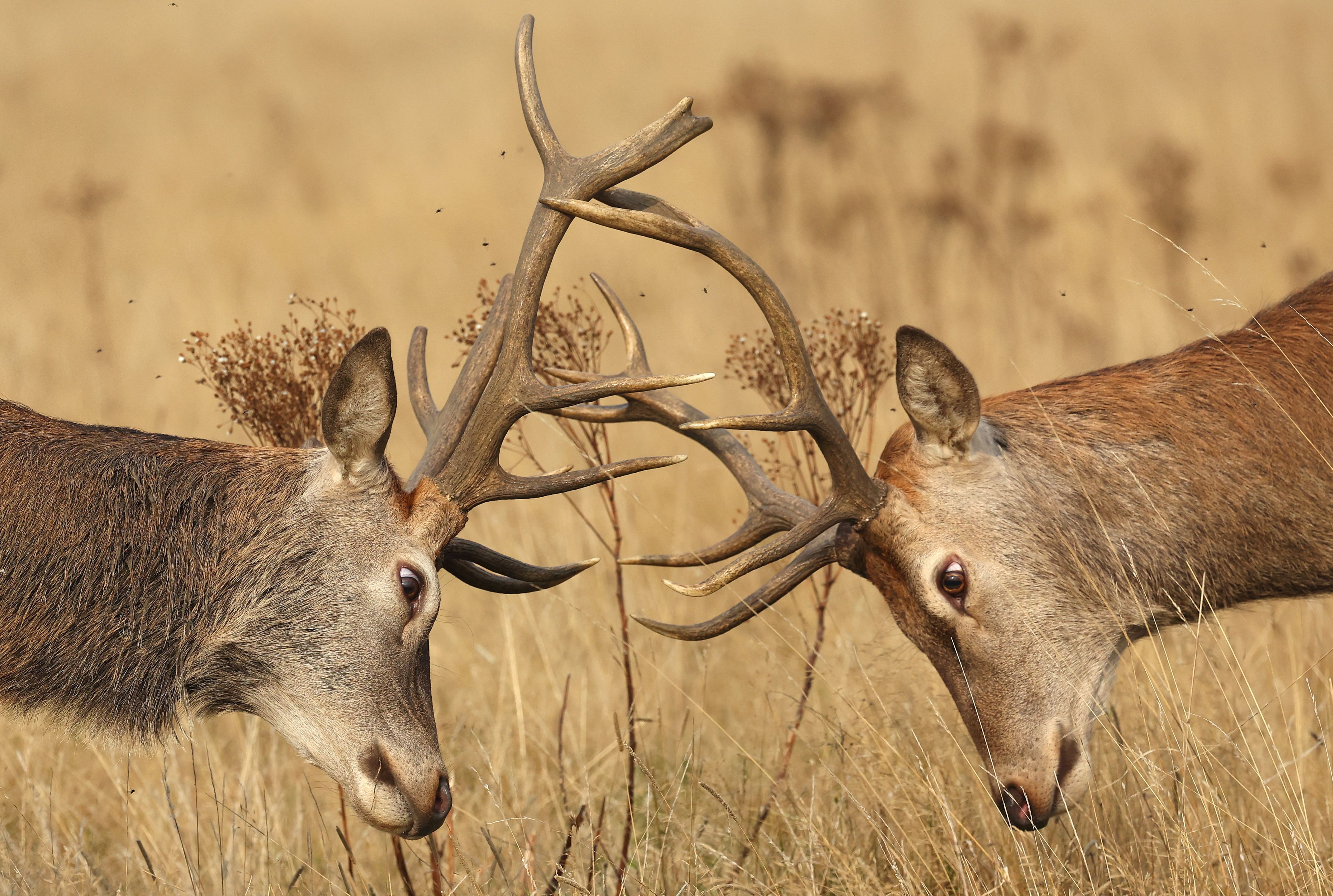 Deer clash antlers as the annual rutting season begins, during above average seasonal temperatures, in Richmond Park, London, Britain, on September 19, 2024. (Photo by Toby Melville/Reuters)