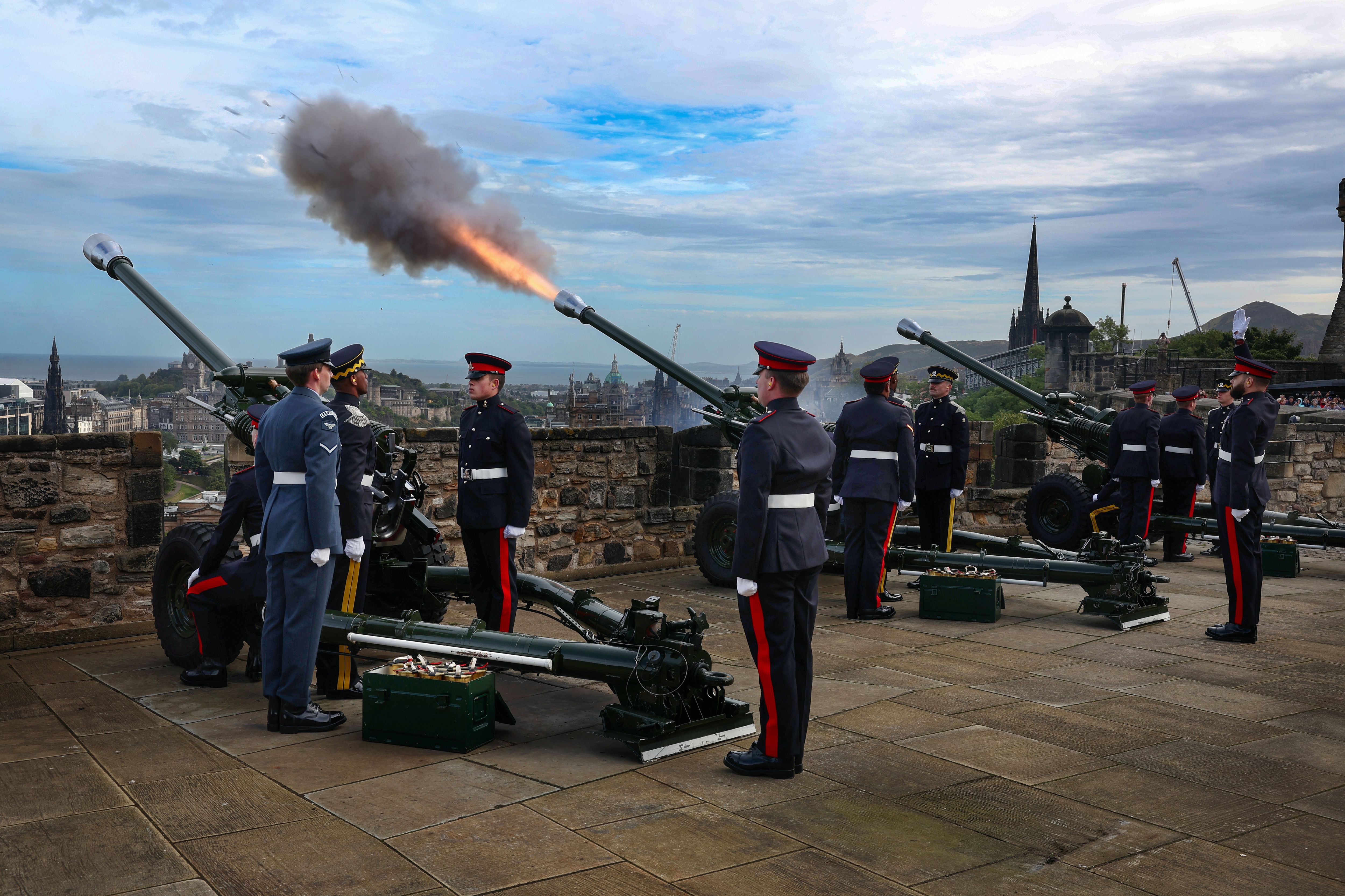 A Royal 21-Gun Salute at Edinburgh Castle was made by the 4th Regiment Royal Artillery The Royal Scots Dragoon Guards and a member of the RAF Regiment on September 09, 2024 in Edinburgh, Scotland. After the death of his Mother, Queen Elizabeth II, on September 8th 2022, her eldest son Charles ascended the throne of the UK and Northern Ireland the next day to become King Charles III. (Photo by Jeff J. Mitchell/Getty Images)