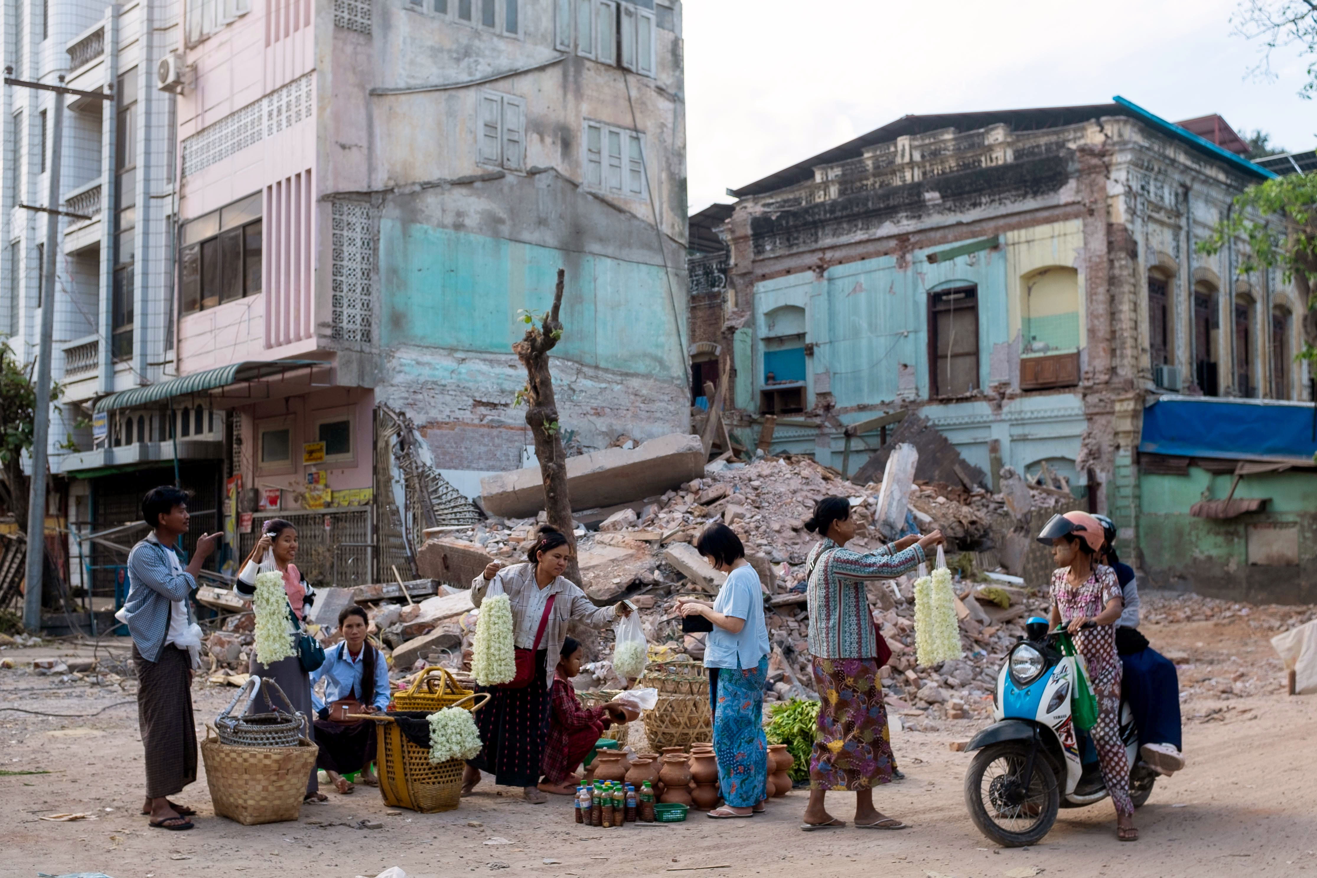Vendors sell flowers near a collapsed building in Mandalay, Myanmar, 12 April 2025. More than 3,000 people have been killed and thousands injured after a 7.7-magnitude earthquake struck the country on 28 March, according to the Myanmar government. (Photo by EPA/Stringer)