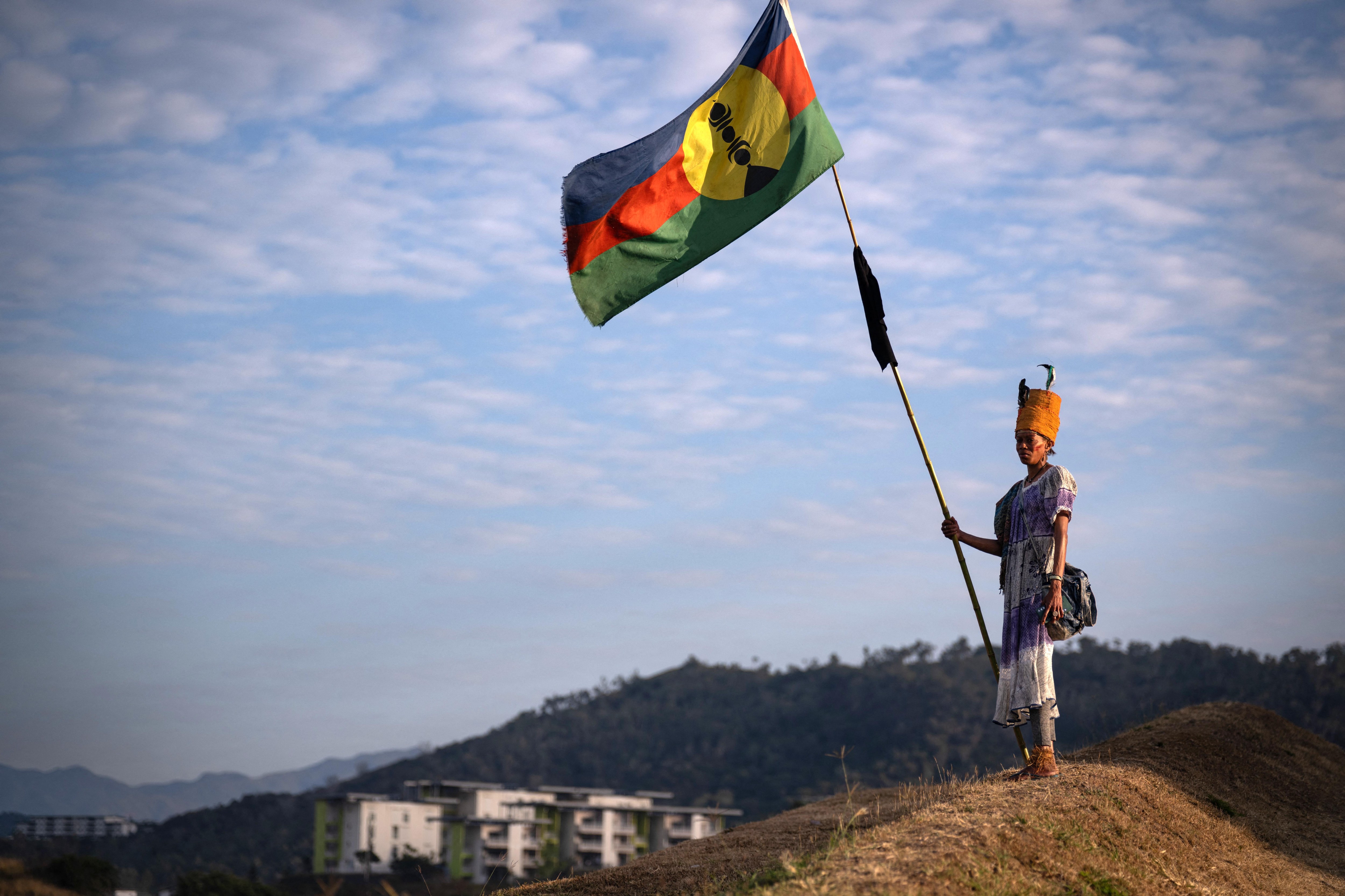 A woman with a traditional dress holds a Kanak flag in the Dumbea district of Noumea, in France's Pacific territory of New Caledonia on September 24, 2024. New Caledonia was on edge on September 24, 2024, with fears tensions could spill over into fresh unrest as the territory marked the anniversary of the French takeover – and some independence figures prepared to issue calls for sovereignty. (Photo by Sebastien Bozon/AFP Photo)