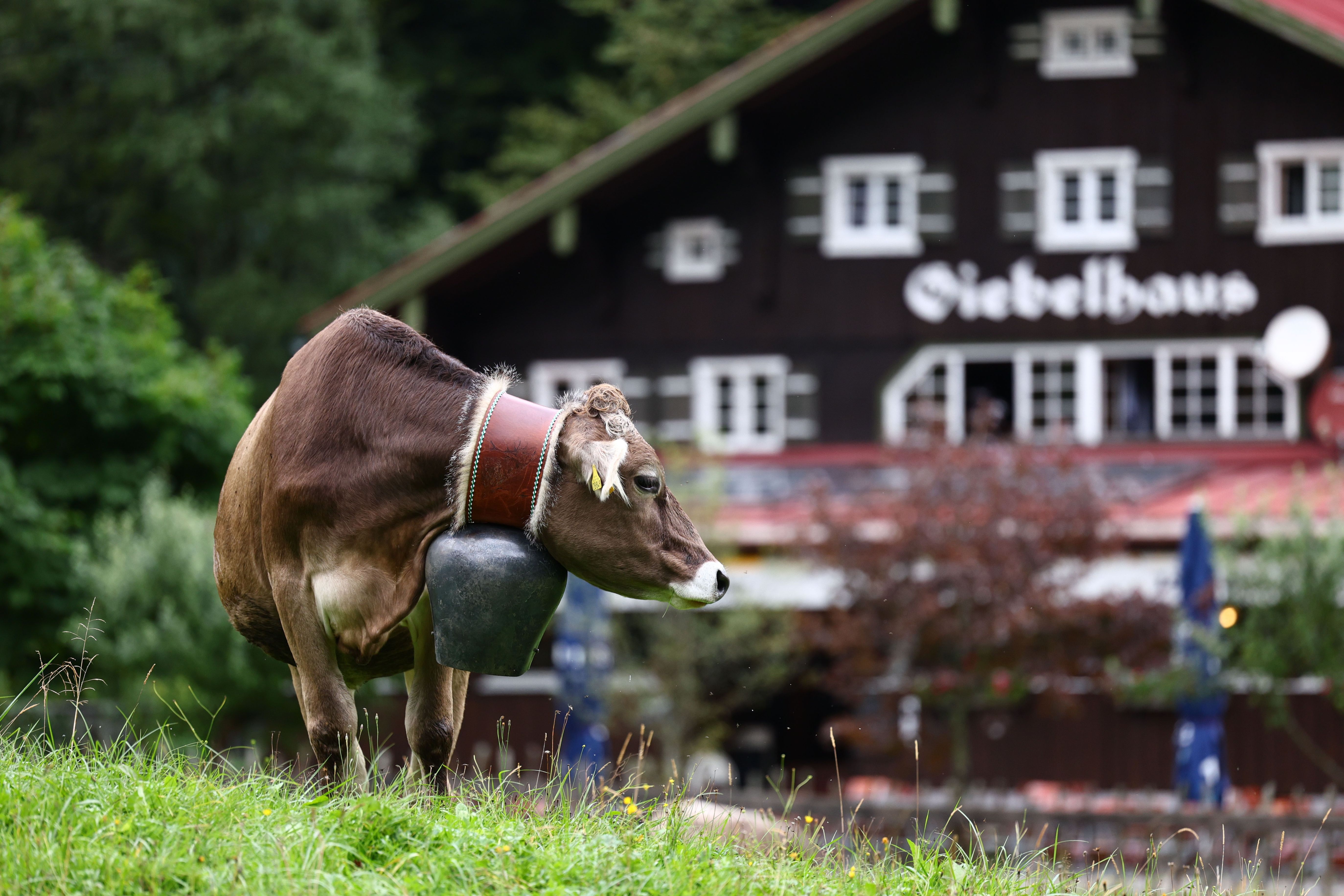 A cow stands on a hill wearing a traditional bell, a day before the traditional Viehscheid festival in Hinterstein, Germany, 10 September 2024. Viehscheid and Almabtrieb are the names of the annual festival which takes place at the end of summer. During the festival the farmers lead their cattle from the mountain pastures to bring them back to the valleys. (Photo by Anna Szilagyi/EPA/EFE)